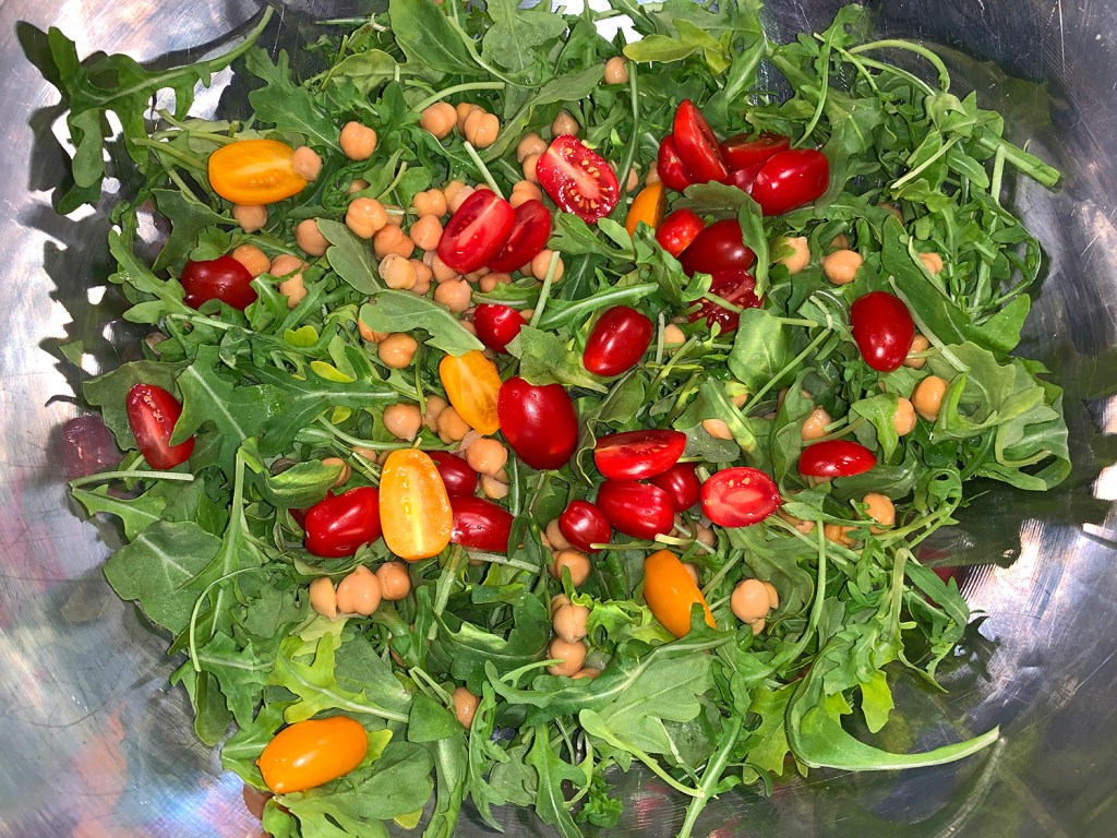Arugula Salad with Cherry Tomatoes, Chickpeas, Hard-Cooked Eggs and Pecorino