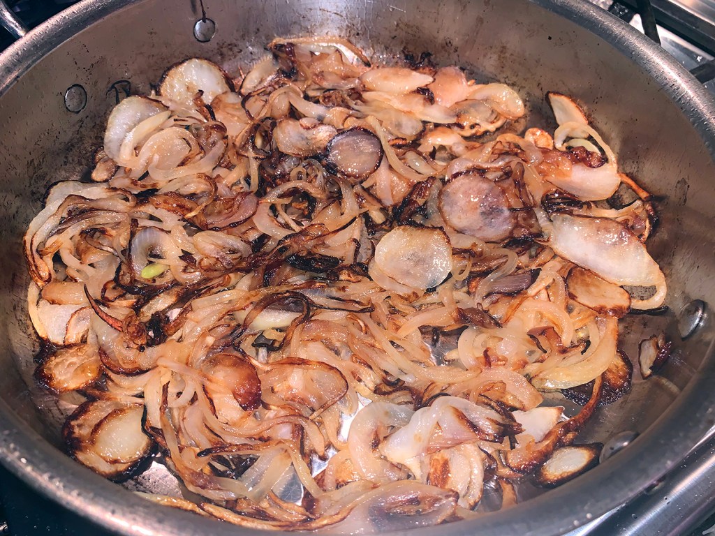 - Meanwhile, in a 12-inch skillet over medium-high, heat the oil until shimmering. Add the onions and cook, stirring only occasionally at the start then more frequently once browning begins at the edges of the pan, until the onions are deeply caramelized and crisped, 10 to 15 minutes; adjust the heat if the onions brown too quickly. Using a slotted spoon, transfer the onions to a paper towel–lined plate and spread evenly. Sprinkle with ¼ teaspoon salt and set aside; the onions will crisp as they cool.