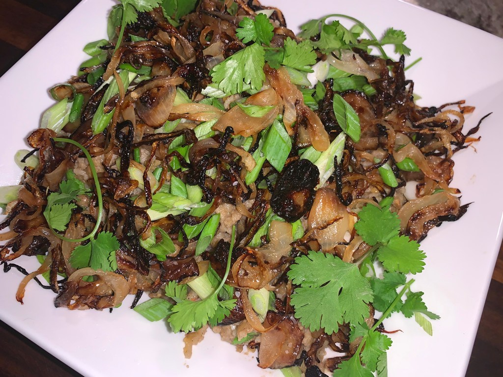 - Stir in half the scallions, then transfer to a serving bowl. Top with the fried onions and remaining scallions.