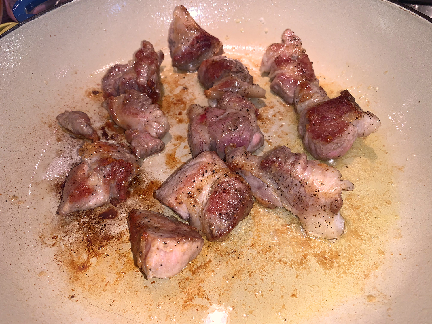 - While the oil heats, sprinkle salt and pepper on half of the pork (you will season in two batches and prevent the meat from sweating as it sits). When the oil is hot, add the seasoned chunks without crowding the pan.