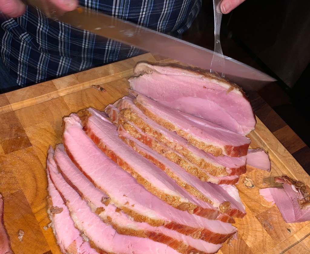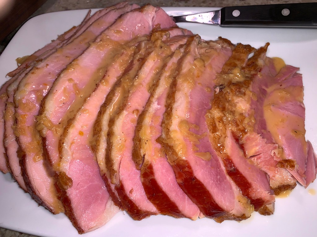 6. Serving: Carve the ham into think slices and serve warm or at room temperature with a bit of the warm sauce spooned over the top.