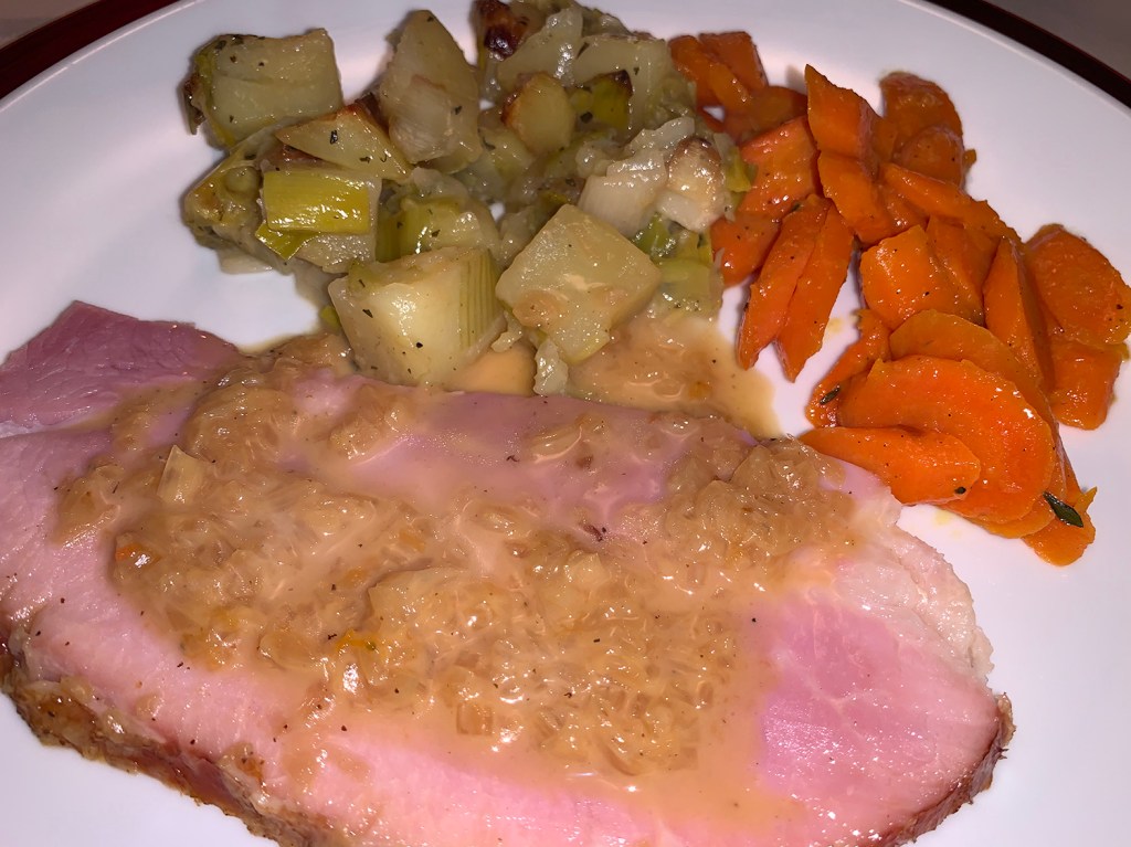 It’s not often we serve a large ham, but when we do, it’s nice to make it a bit special, such as this Ham Braised in Madeira with Rosemary & Peppercorns by Molly Stevens. After 11 months of still dealing with all of the pandemic restrictions and social isolating, we took a plunge and had good friends Rosanne and Gary over for dinner.