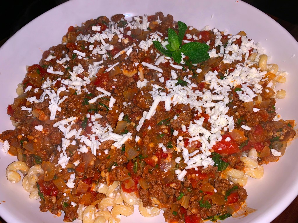 Cellentani with Spiced Beef, Onion Sauce and Feta