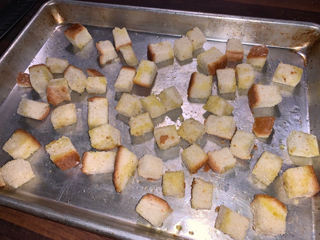 Preheat oven to 450°F. In a shallow baking pan toss bread cubes with 1 tablespoon oil. Spread in an even layer. Bake for 8 minutes or until toasted, stirring once. Sprinkle with Parmesan and finely chopped parsley; toss to coat. Transfer to a piece of foil to cool.