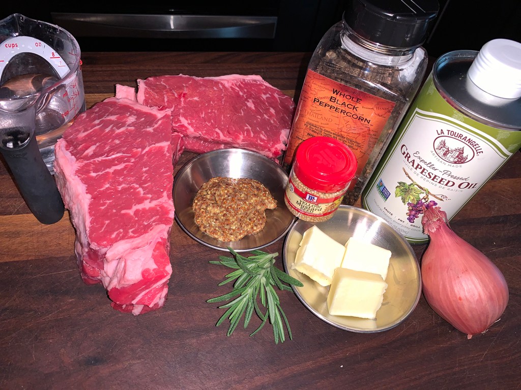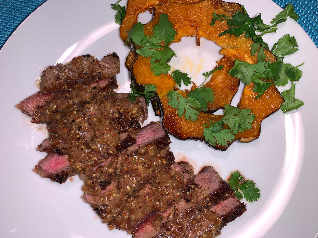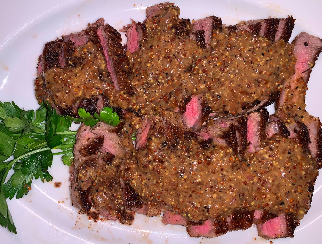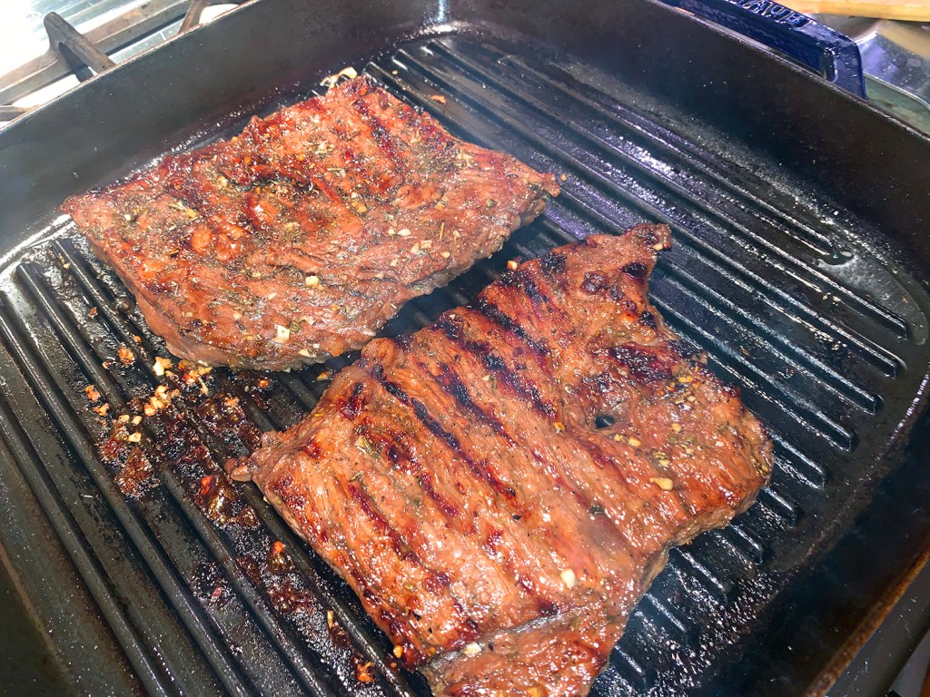 When we first made this, it was the beginning of December with cold temperatures, so our outdoor grilling option was off the table. But there are two other choices available. Finish the steak on a grill pan, like we did; or cook the steak in a cast iron skillet that had been preheated in a 500 degree oven with olive oil. Either way, it takes 5 minutes or less to cook to medium-rare. The directions below give you the steps for either option.