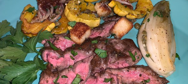 A simple quick protein paired with an easy, delicious side dish of roasted chicories, simply fabulous! The marinated skirt steak recipe, compliments of Martha Stewart, can marinate for as little as 15 minutes, or overnight. We soaked ours for 1 hour and 30 minutes.