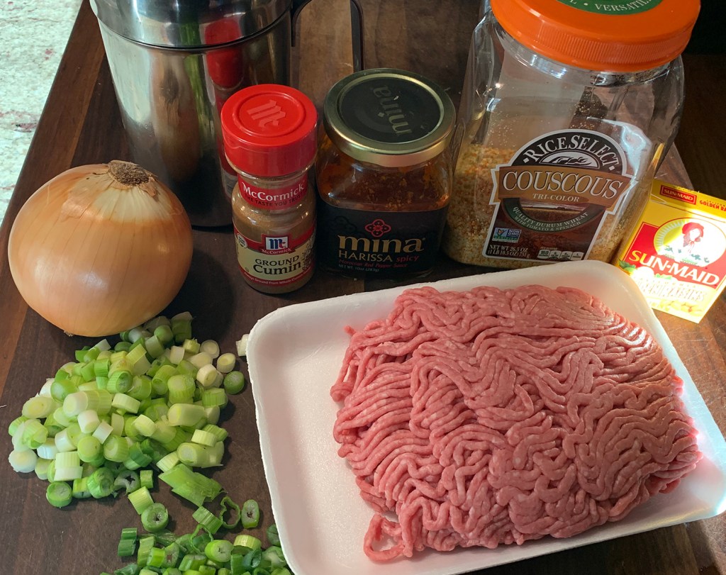 Harissa is a North African spice paste whichis used as the flavor base for this simple skillet-cooked meat sauce, as well as to season the couscous that’s served alongside. Scallions play a dual role in this dish—the whites are caramelized to lend depth of flavor to the sauce and the greens are sprinkled on as a garnish.