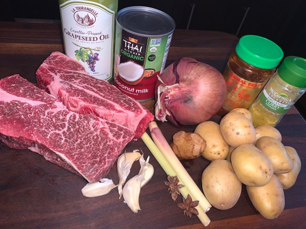 Season the beef with salt and pepper; set aside. In a large Dutch oven over medium-high, heat the oil until shimmering. Add the onion, garlic, ginger, lemon grass, curry powder, star anise and 1 teaspoon salt. Cook, stirring often, until the onion begins to soften and the mixture is fragrant, about 3 minutes.