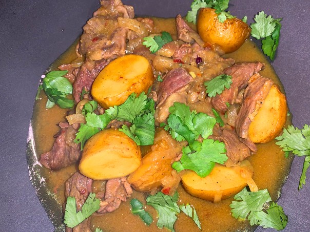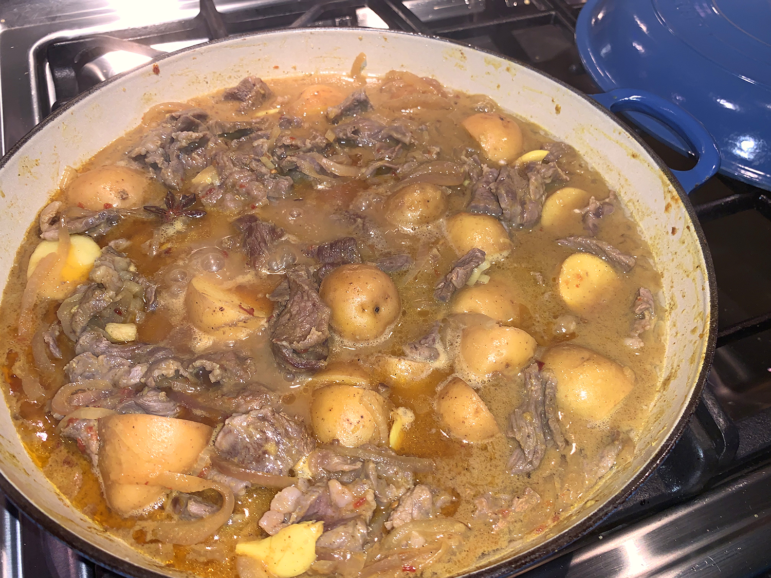 Add the beef, potatoes, coconut milk and sambal, then bring to a simmer, scraping the bottom of the pot. Reduce to medium-low, cover and cook, stirring occasionally, until a skewer inserted into the largest potatoes meets no resistance, about 30 minutes (or longer).