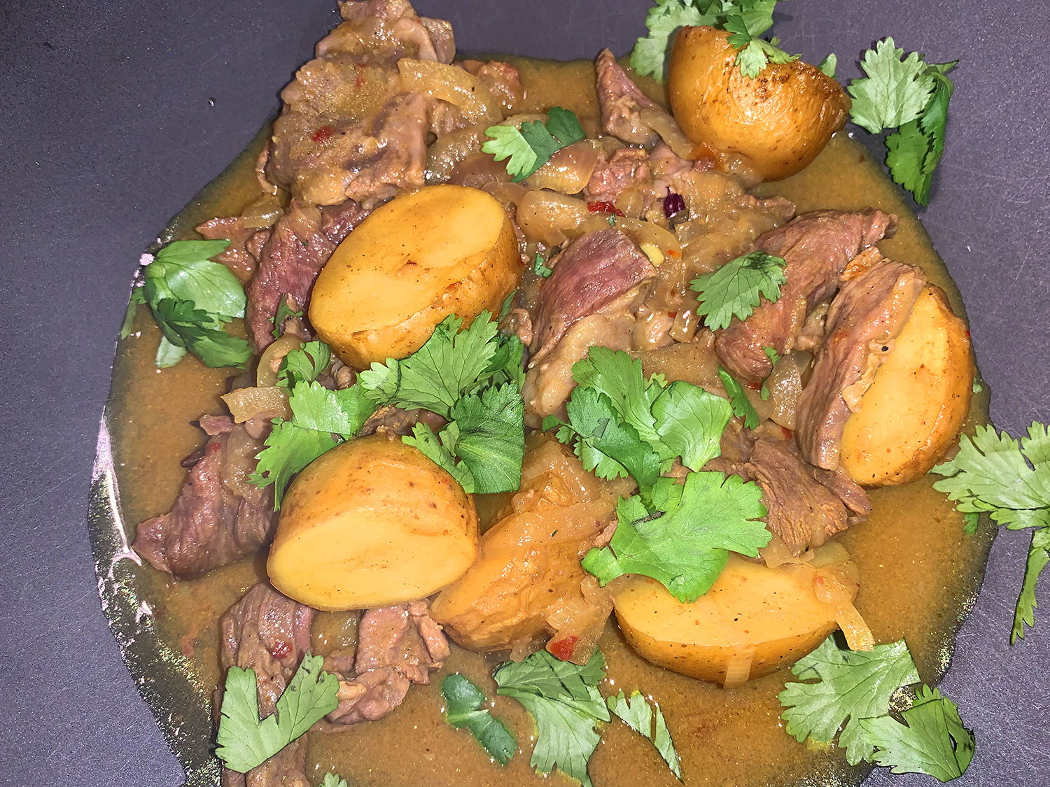 Then, the potato halves, which were supposed to be tender after 30 minutes, were still too firm after 45. I fished them out of the curry, and microwaved for several minutes before reuniting them with the other ingredients. For a pop of color, chopped cilantro was added as a final garnish.