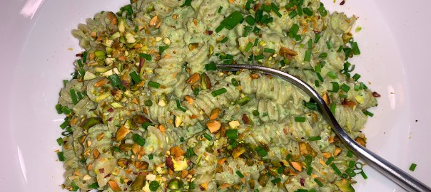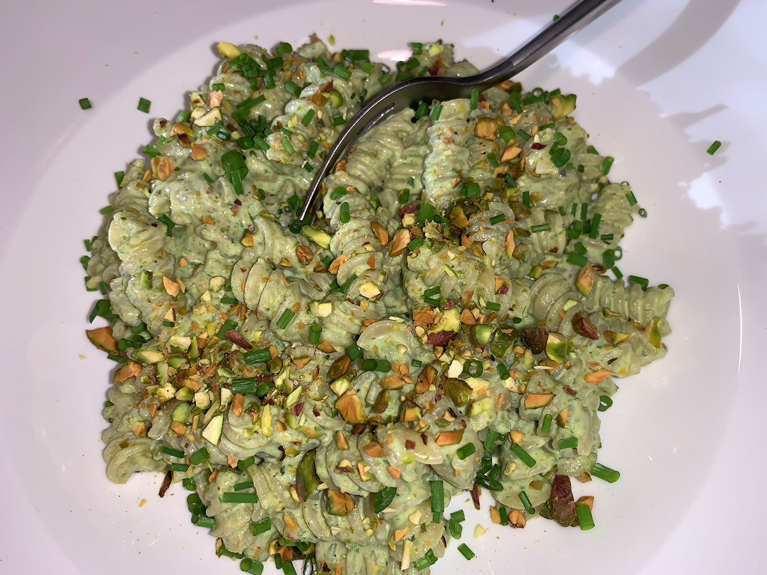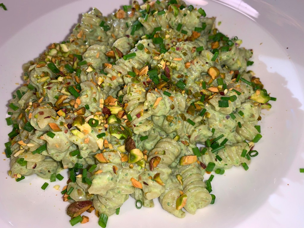 Pour the pesto over the pasta and stir, adding more reserved pasta water as needed so the sauce coats the noodles. Taste and season with salt and pepper. Serve drizzled with additional oil and sprinkled with the chopped pistachios.