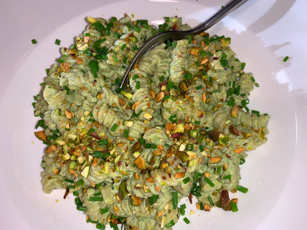 Milk Street advises NOT to use toasted or roasted pistachios because they claim, in this case, raw pistachios are best. Their bright color and natural sweetness lend a vibrant, full-flavored pesto. Well, as I mentioned, we had the roasted salted pistachios and went ahead and used them.