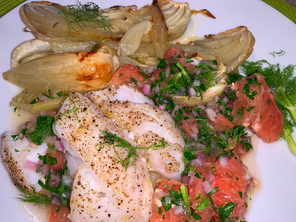 The recipe calls for four fish fillets, but with only the two of us at the dinner table, we simply bought a one-pounder fillet and split it. As far as the fennel, once roasted, it not only dissipates the licorice flavor (which deters some people from eating it), but it takes on a subtle, sweet flavor, which makes a great counterpoint to the grapefruit salsa.