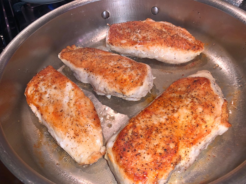Remove skillet from heat; add oil. Swirl to coat bottom of skillet. Return to medium-high heat. Add chicken (don’t crowd the pan). Cook for 5 minutes or until a crust forms (be patient; the chicken will release when it’s ready to be turned). Turn and cook for 5 to 7 minutes more—or until chicken is done at 165°F. Adjust heat as necessary.