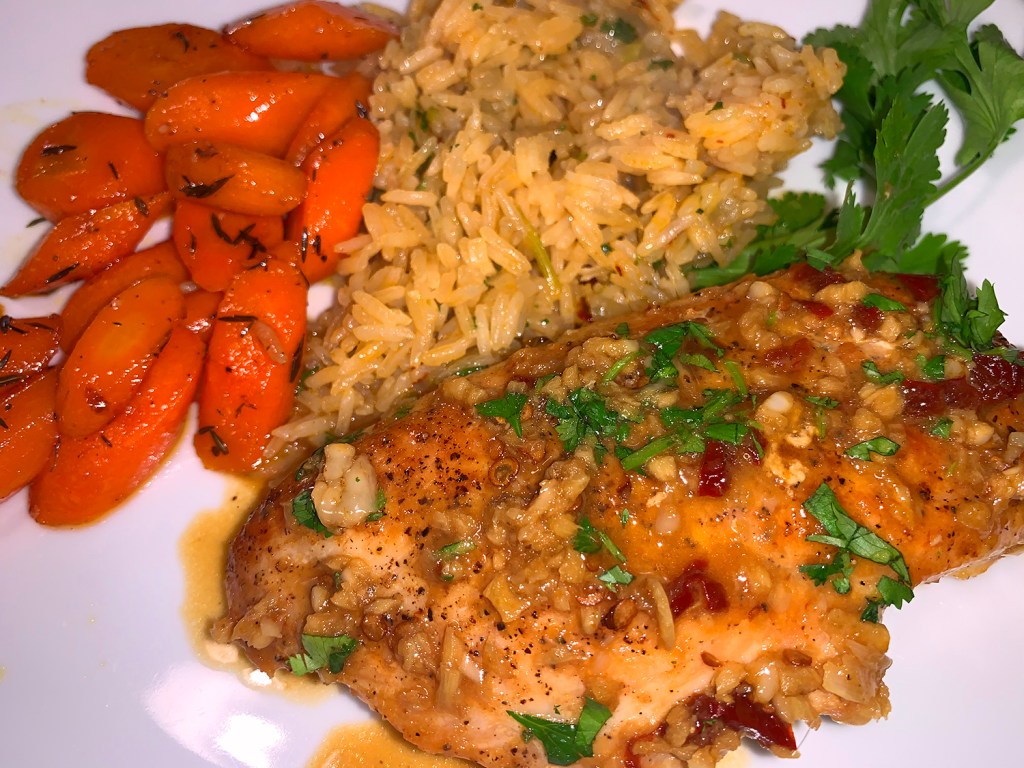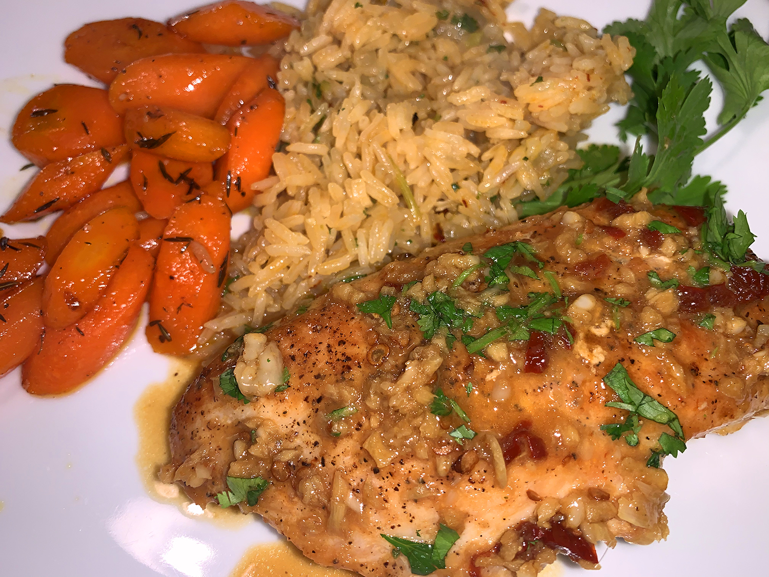 Instead of just serving with plain steamed rice, we upped our game and made rice pilaf which also included a chipotle chile pepper. The other companion side served was glazed carrots.