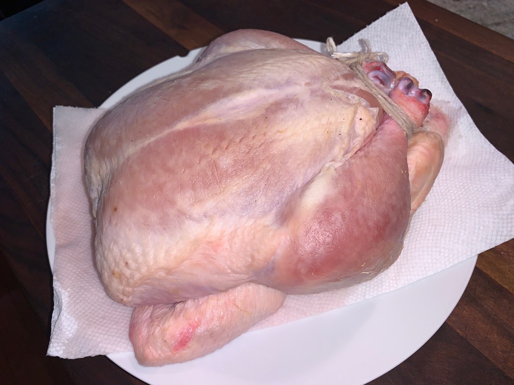Tie legs together with kitchen twin. Let sit 1 hour minimum. Salting the chicken ahead of time allows the seasoning to really penetrate the meat. An hour is great, but longer is even better. Chill the salted bird, uncovered, up to 1 day, which is what we did.