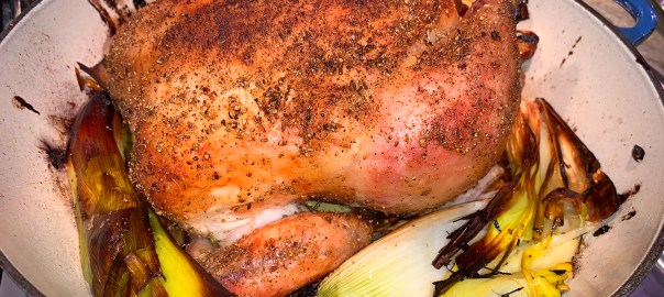 Place chicken in the center of the skillet. Arrange the leek halves around the bird for a built-in side dish.