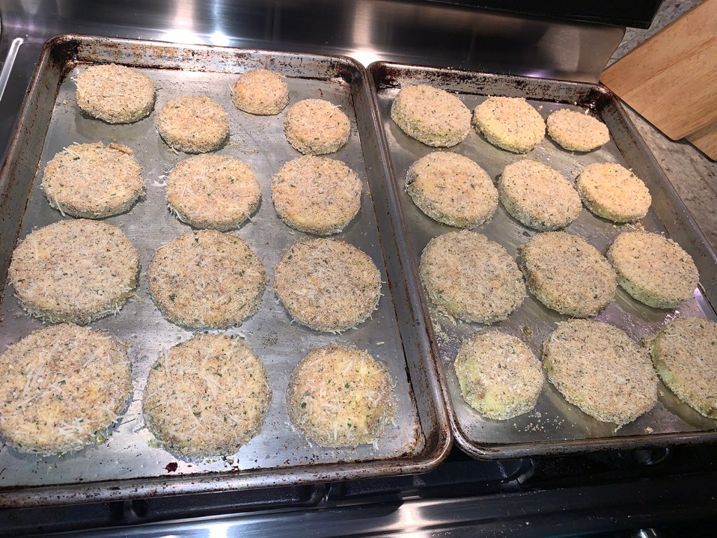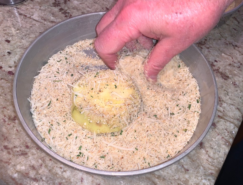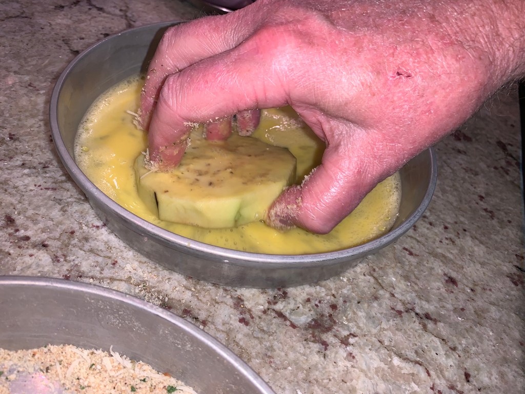As we prepped the dish, we realized that a few tweaks to the recipe were needed. After coating the slices for one of the eggplants, we noted there would not be enough for all the remaining slices, so we quickly increased by about another 50%; while the amount of egg wash was spot on.