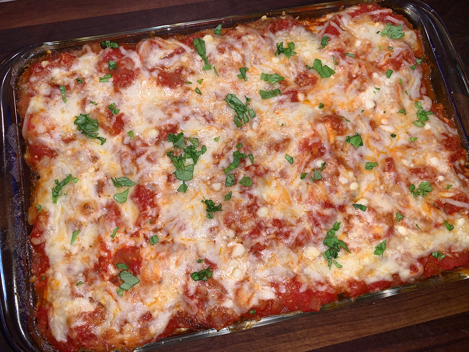 The shredded mozzarella was increased to 2 cups from 1 1/2, although we would even increase it more next time! The dried basil was swapped out for fresh, making sure to add it between layers as well as a garnish. One of those grocery store clamshells of basil is the perfect amount. These changes are noted in the ingredients below.