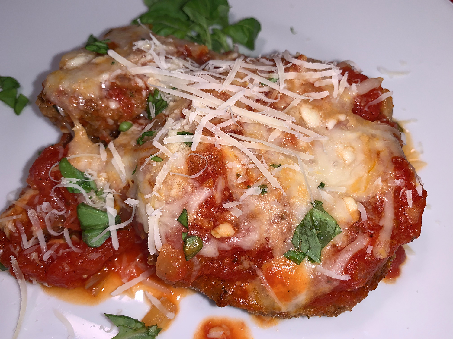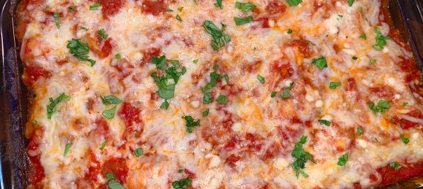 It’s not unusual that most of us would like to cut calories and fat where we can, but not loose flavor. With this riff on a Martha Stewart recipe, you bake rather than fry, for less mess and less fat. In addition, there is no salting of the eggplant to extract moisture—a process I’ve never grown fond of.