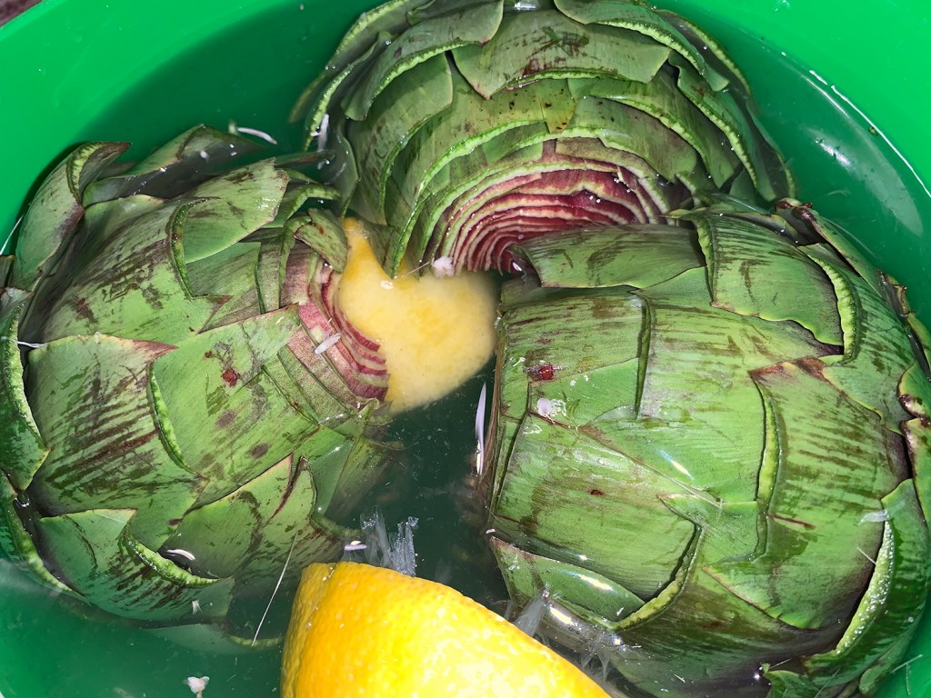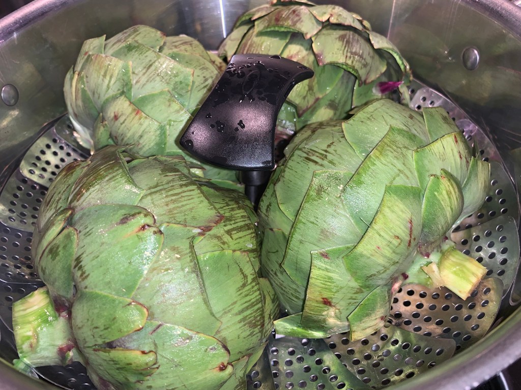 Cover. Steam for 20 minutes (less or more, depending on the size of the artichokes), until you can easily pull off the outer leaves, and you can pierce the heart easily with a knife.