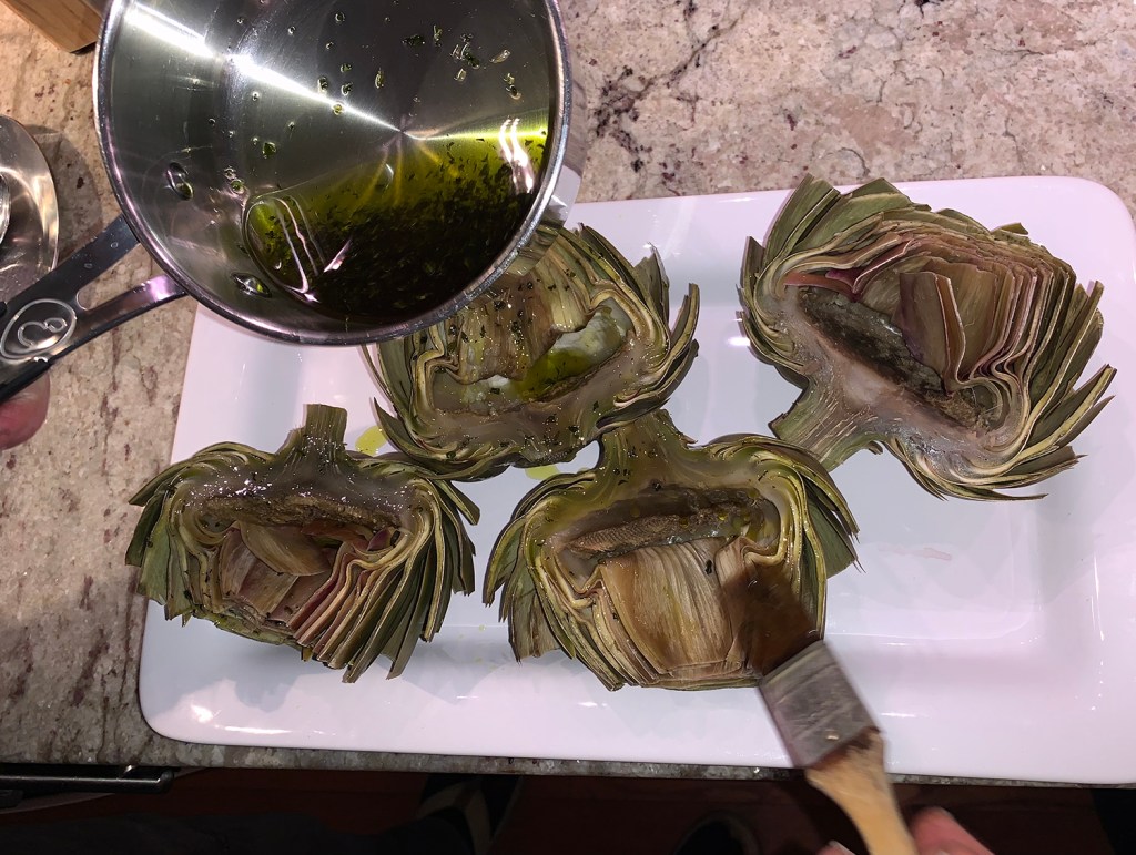 The artichokes can be just a tiny bit less cooked than would be typically perfect for steamed artichokes, as you will be cooking them further on the grill.