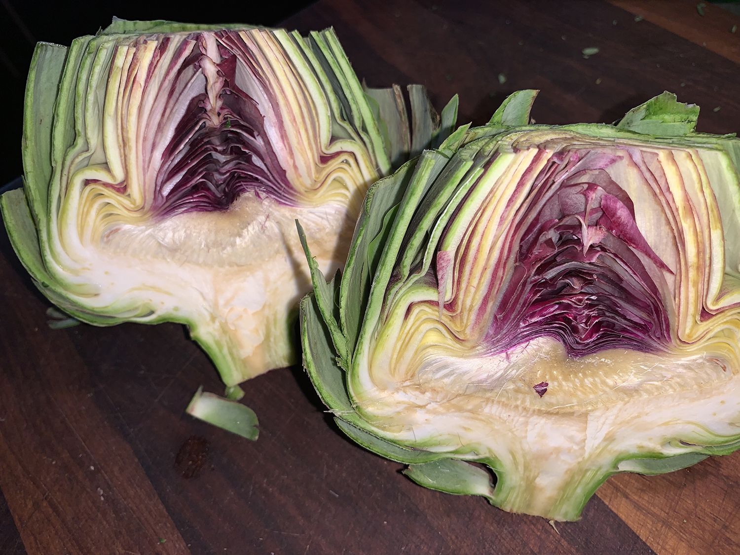 Let’s just say prepping these puppies was a little labor intensive, especially scooping out the fuzzy chokes. Instead of rubbing all of the cut areas, including each leaf to prevent the artichokes from turning brown, we acidulated them. This is done by filling a large bowl with 2 quarts of water, slicing a lemon in half, and squeezing the juice into the water, leaving the rinds submersed in the liquid.