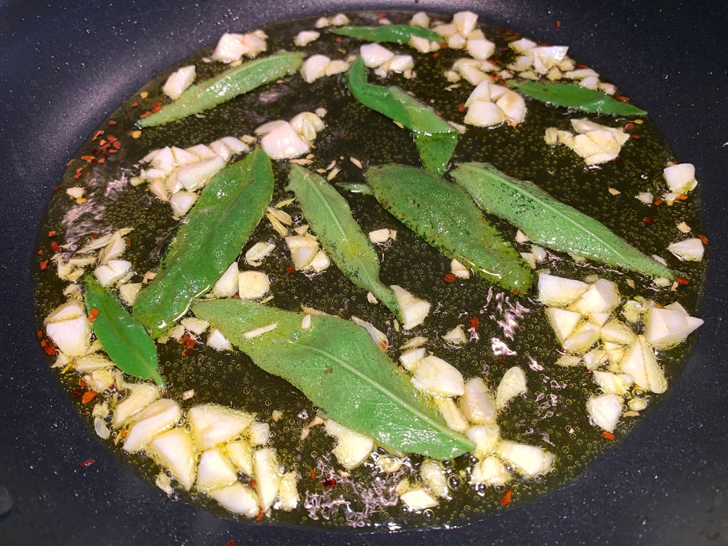 - Heat the oil in a nonstick skillet. When hot, add the sage leaves, chopped garlic and red pepper flakes. Fry for 3-4 minutes, stirring a few times.