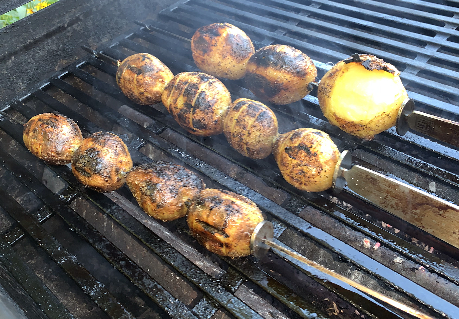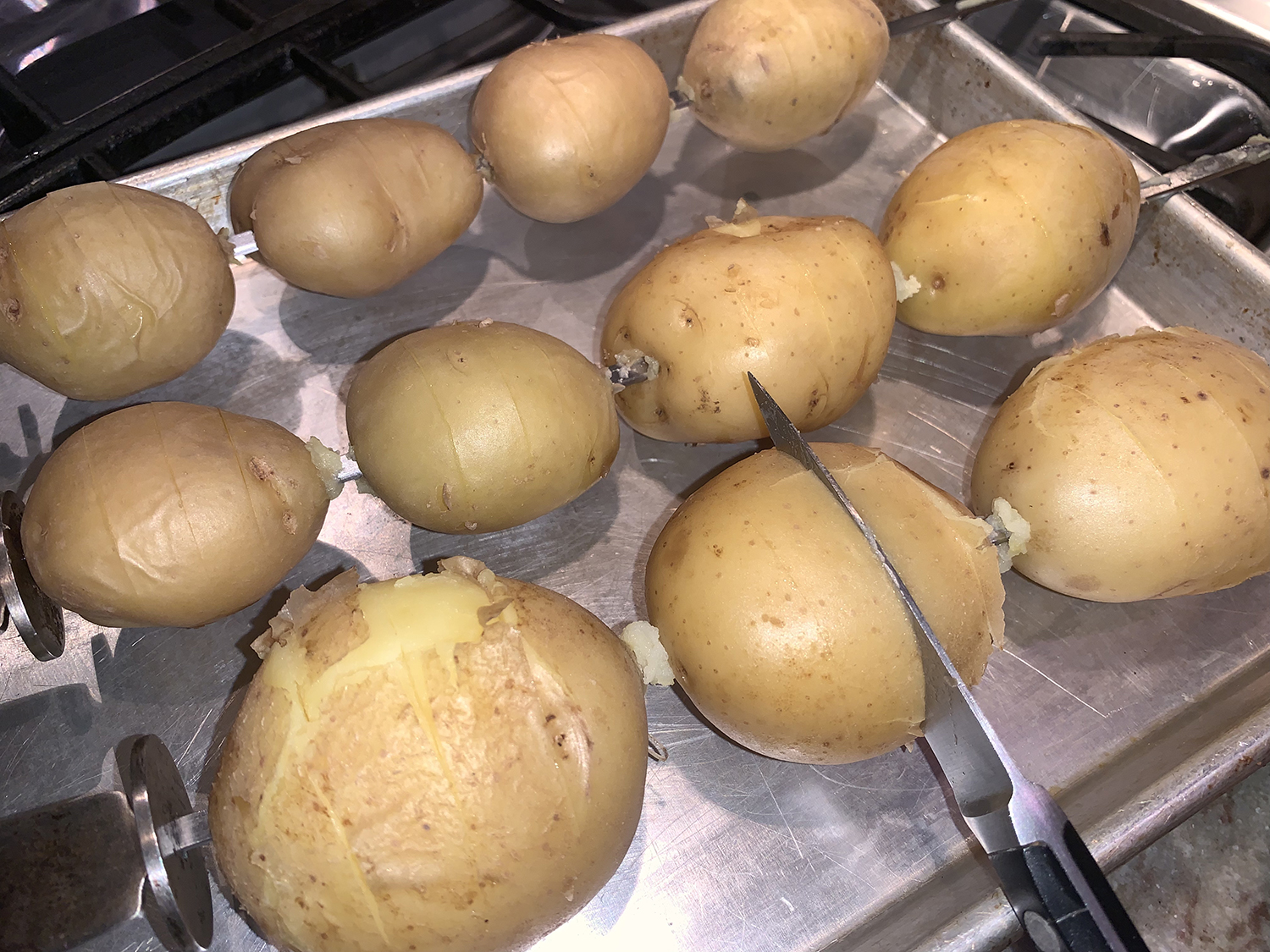 - Thread the potatoes lengthwise onto each of three 12- to 14-inch flat metal skewers, dividing them evenly. Using a paring knife, make 4 or 5 parallel crosswise cuts into each potato, stopping when knife blade reaches the skewer; leave the second sides of the potatoes uncut. Brush the potatoes on all sides with about ½ of the melted butter and season with salt and pepper.