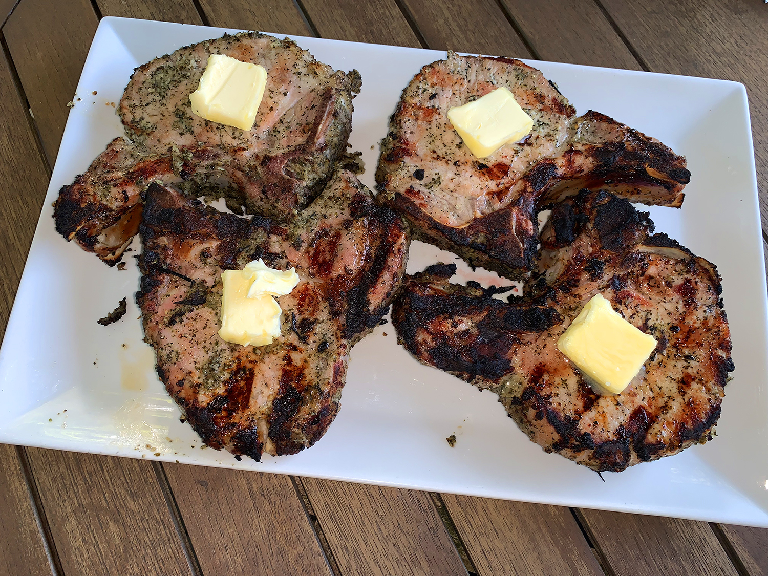 - Move the chops to the hot side of the grill and cook, uncovered and turning occasionally, until well-browned on both sides and the centers near the bone are just barely pink when cut into or reach 135°F, 5 to 8 minutes. Transfer to a platter, place 1 piece of the butter on each chop and tent with foil. Let rest for 15 minutes.