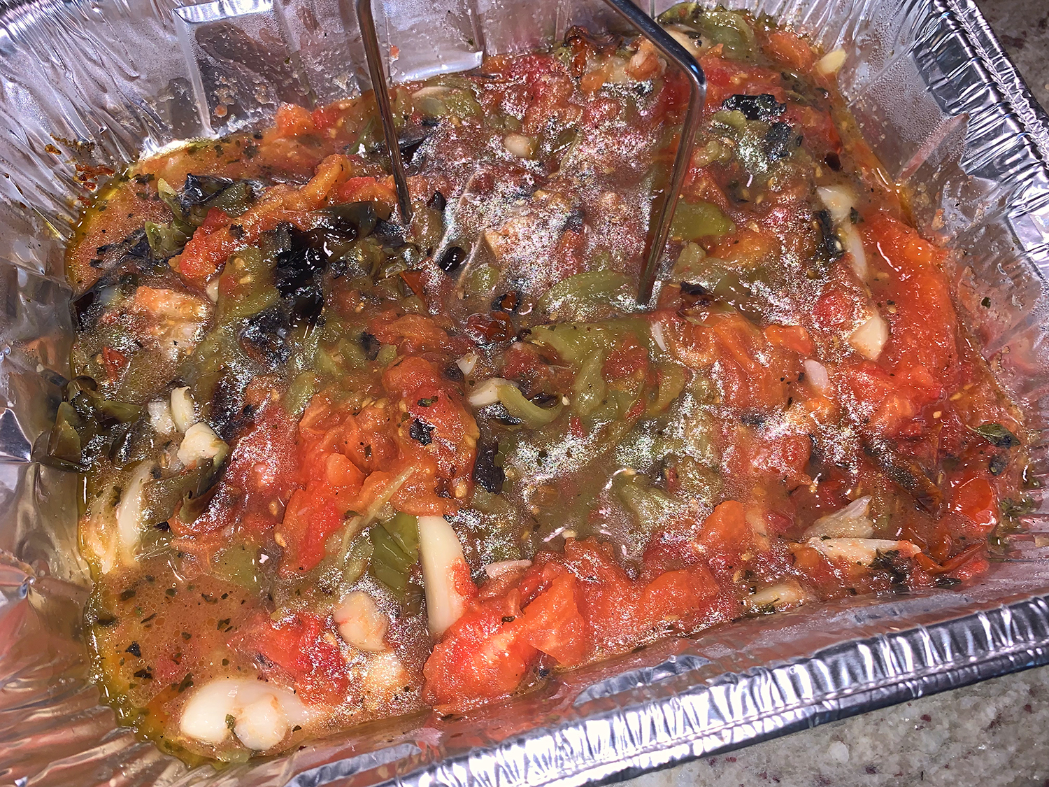 - Meanwhile, uncover the pan; the vegetables and garlic cloves should be completely softened. Using a fork, mash the vegetables until broken down but a bit chunky. Use tongs to remove and discard any large pieces of tomato or pepper skins that do not break down. Stir in the remaining 2 tablespoons butter until melted, followed by the vinegar. Season with salt and pepper to taste. Transfer to a serving bowl and serve with the pork.