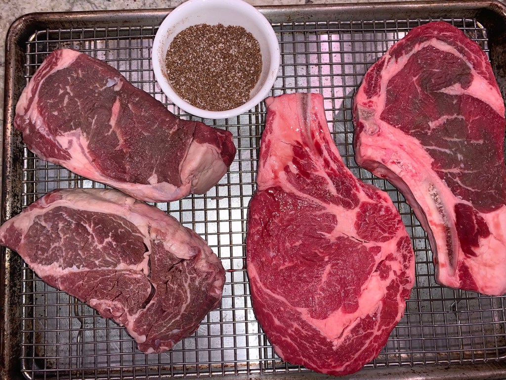 Now you can use a whole chicken and cut it up saving the neck, back and wingtips for homemade stock—which is our typical rodeo—however, this time we purchased precut bone-in, skin-on breasts and thighs. They were well-salted inside and outside the skin, left uncovered in the refrigerator overnight, and marinated for 2 hours prior to cooking.