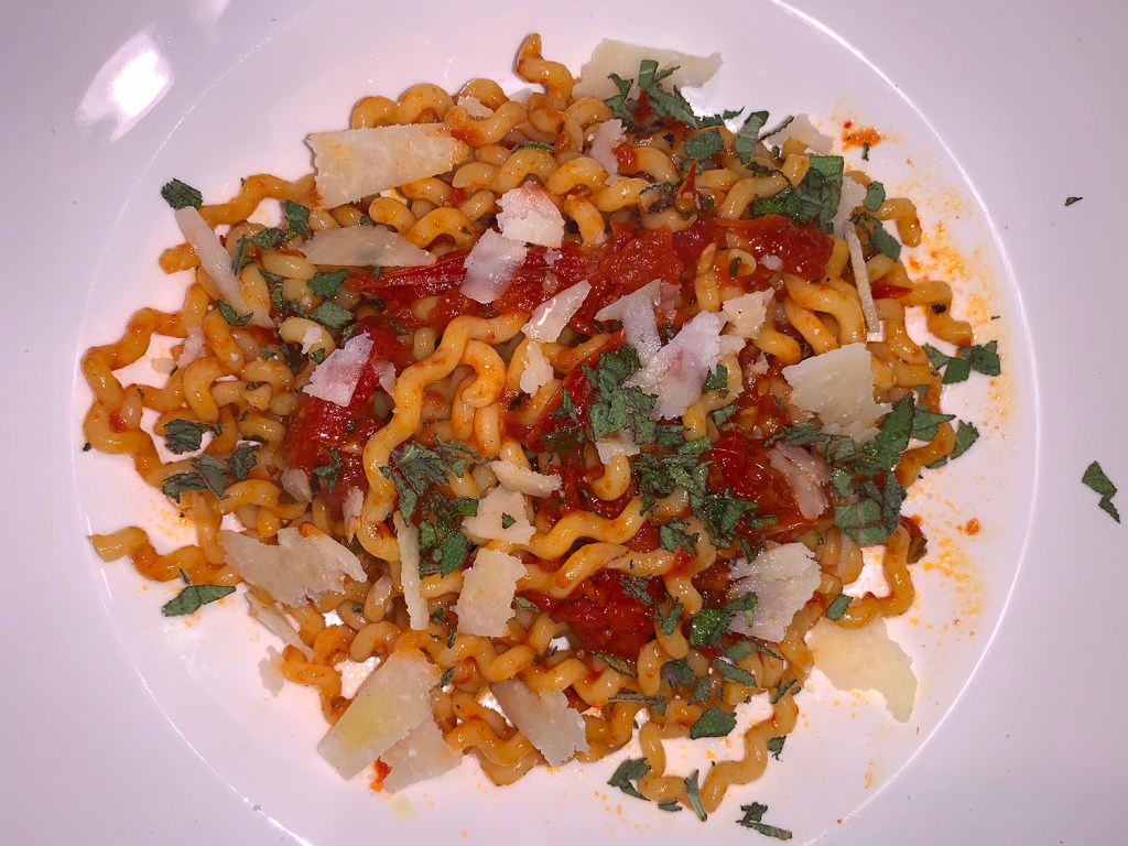 Fusilli was our choice, but spaghetti or bucatini (a tubular pasta resembling thick spaghetti) also pairs particularly well with the sauce. Be aware that you do not want to simmer the tomatoes until there is no liquid remaining. Some moisture is needed for the sauce to cling to the pasta.