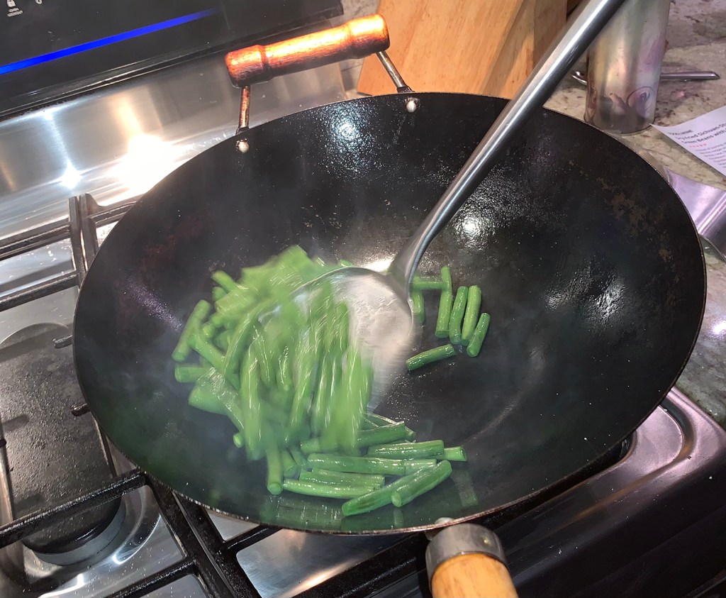 Heat a 14-inch flat-bottomed wok or 12-inch skillet over high until a drop of water evaporates within 1 to 2 seconds of contact. Swirl in 1 tablespoon oil. Add beans, and sprinkle with salt; reduce heat to medium-low so that beans are barely sizzling.