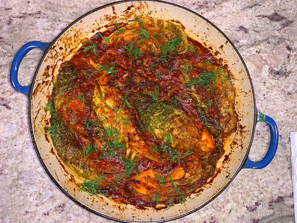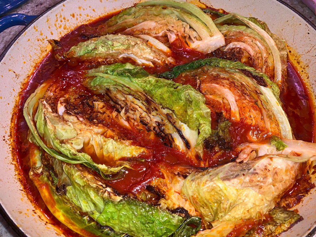 If the spiced tomato paste has reduced and the pan starts getting dry and dark before the cabbage is ready, just add a splash of water to loosen and let it keep going.