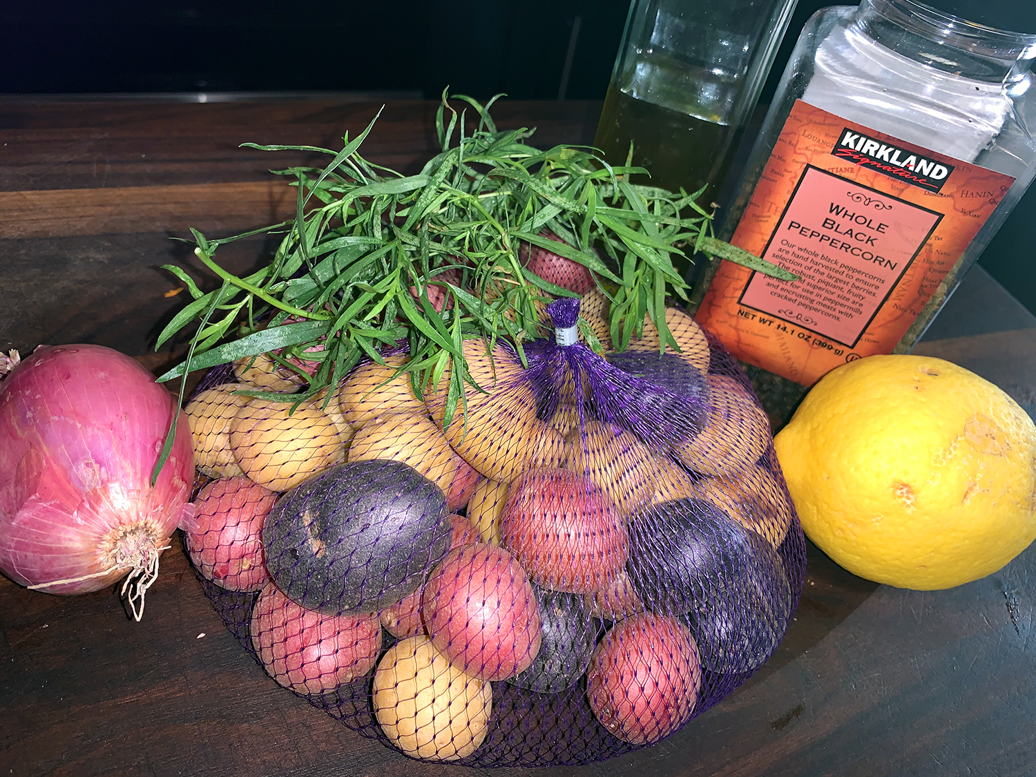 The original recipe called for mixed-color fingerling potatoes, but the grocery store was plum out of any type of fingerlings. However, there were some tri-colored baby spuds available. And I mean “baby” to the point of almost preemies! Thus I knew the cooking time was going to be drastically reduced.