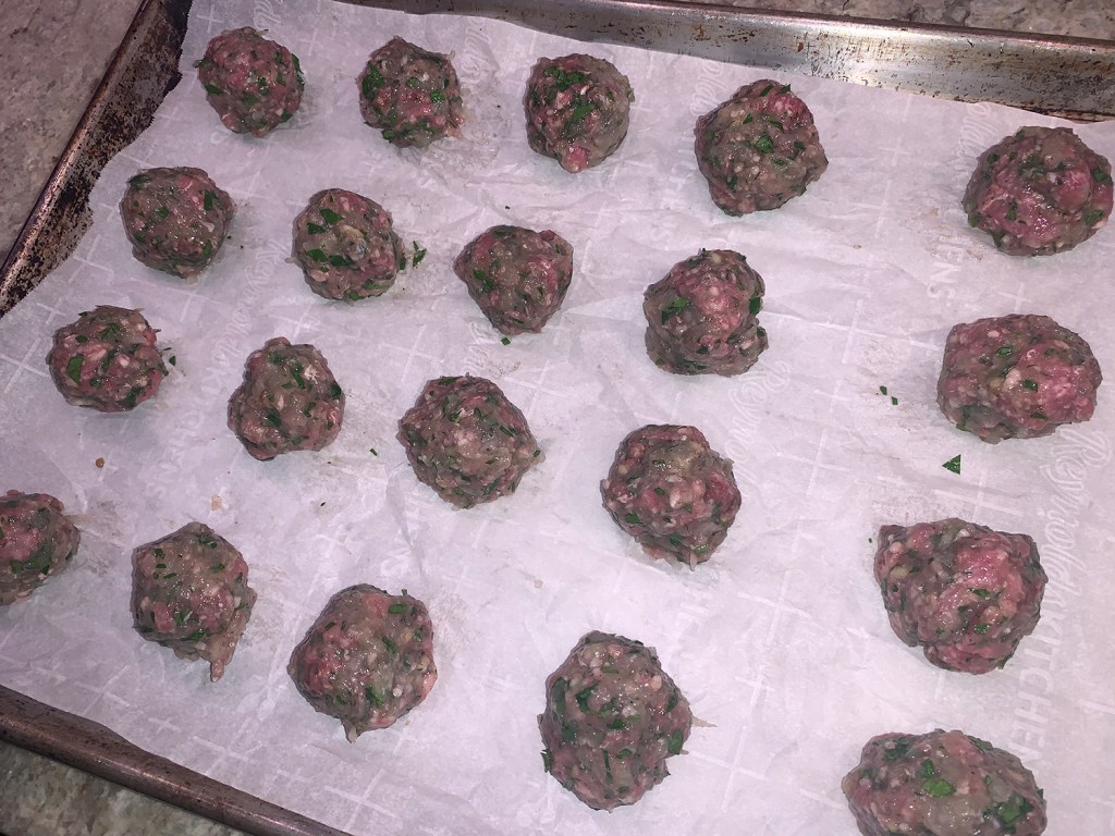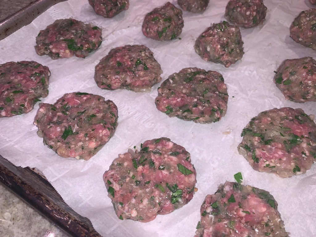 I doubled the garlic, putting half of it in the meat mixture, the other half in the tomato sauce. To press the meat balls into 1/4″ thick discs, I used a flat-bottomed glass that was dipped into cool water between each smashing. Then I put the entire tray into the freezer for 10-15 minutes to firm up while the potatoes cooled. This made it easier for assembly.