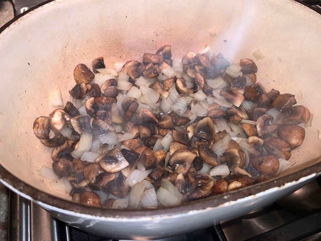 In a large pot over medium-high, heat the oil until shimmering. Add the onion and mushrooms; cook, stirring occasionally, until the onion is softened and the mushrooms release moisture, 6 to 8 minutes.