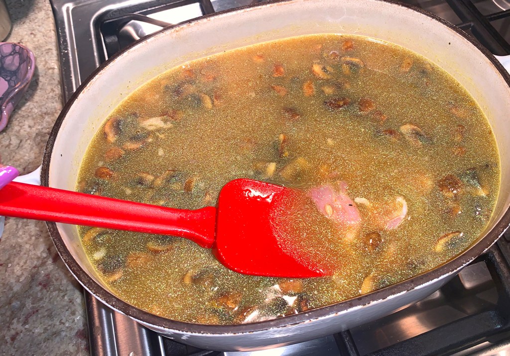 Though barley’s natural starch lends the soup body, béchamel, a mixture of butter, flour and milk, also is traditional for added richness and thickening. For ease, the béchamel is skipped and instead a tablespoon of flour is simply mixed into the sautéed onion and mushrooms, with a swirl of a little cream at the very end.