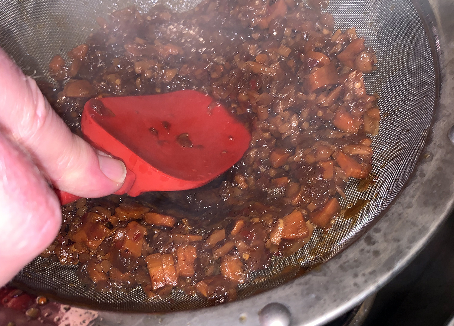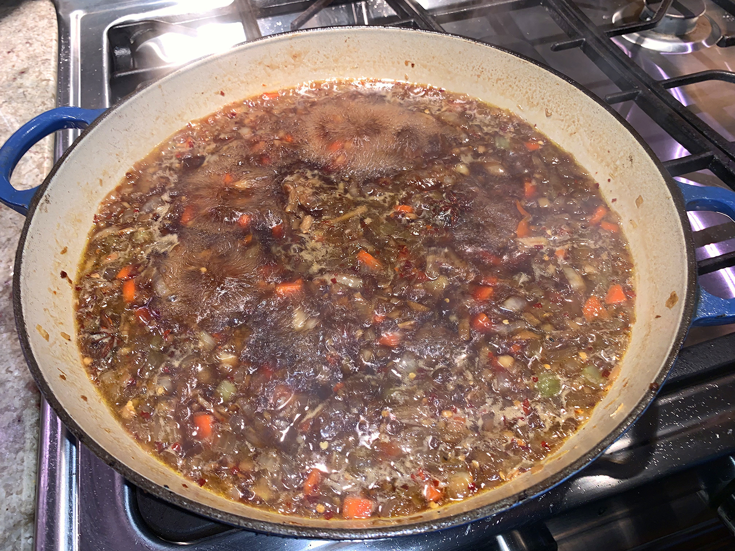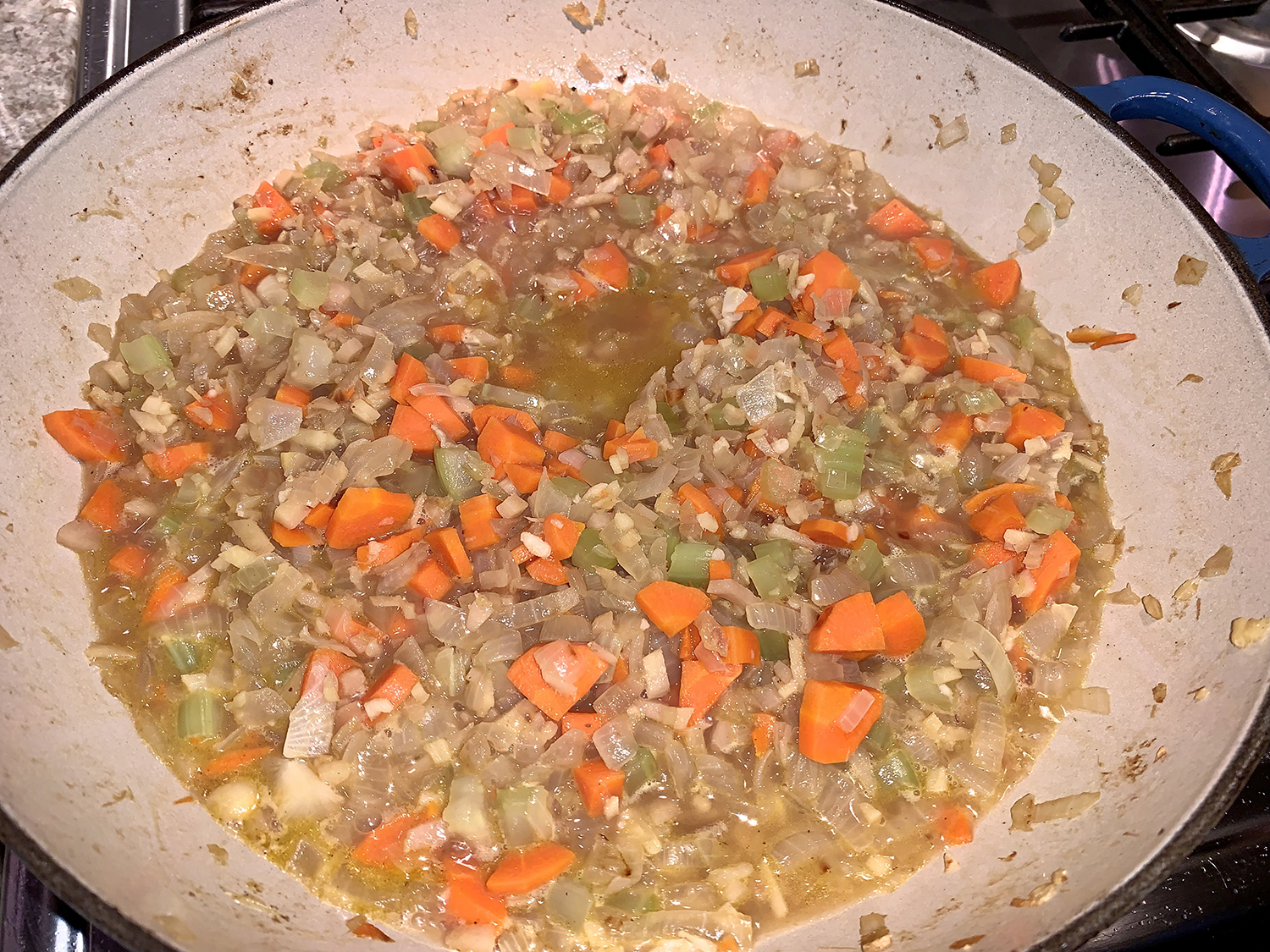 - Discard oil from pan and add onion, celery, carrots and ginger. Caramelize on medium high heat, stirring frequently, for about 8 minutes. Add garlic and sauté briefly, about 2 minutes.