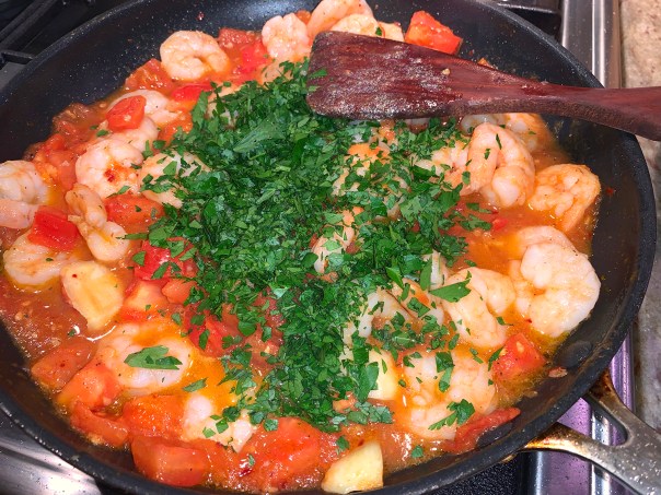 Stir in the shrimp with accumulated juices and cook, stirring occasionally, until the shrimp are opaque throughout, about 2 minutes. Off heat, remove and discard the garlic cloves and stir in the basil, then taste and season with salt and pepper.