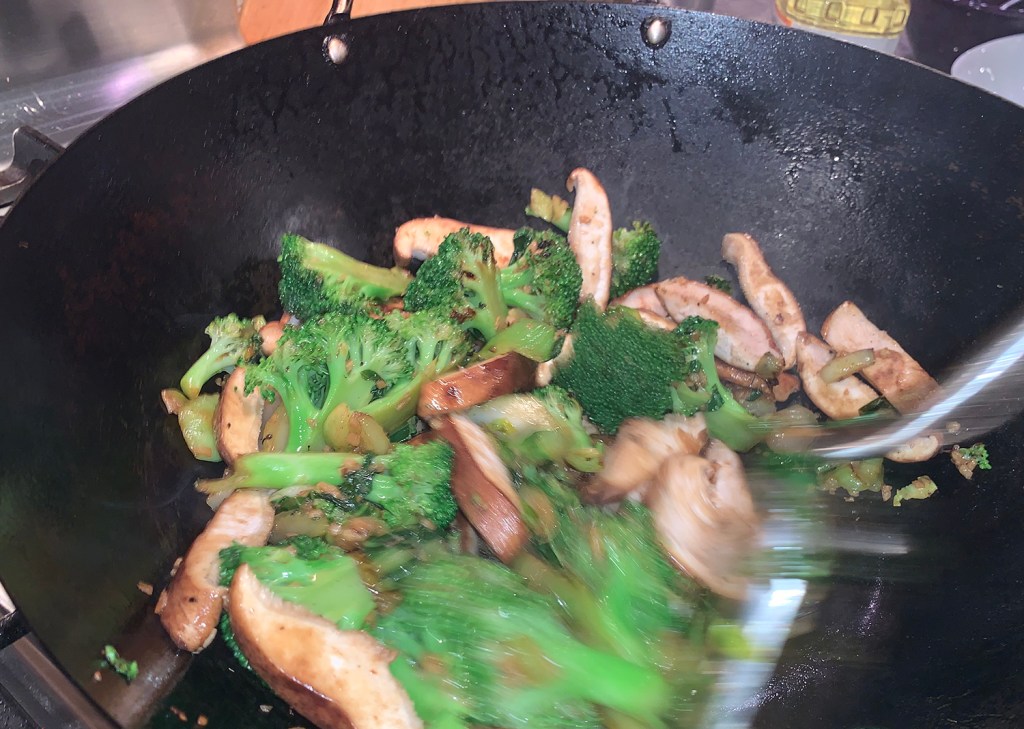 Add garlic and ginger to the pan and cook, stirring constantly, until fragrant, about 30 seconds. Add broccoli and bok choy; cook, stirring, until the broccoli is bright green, about 2 minutes.