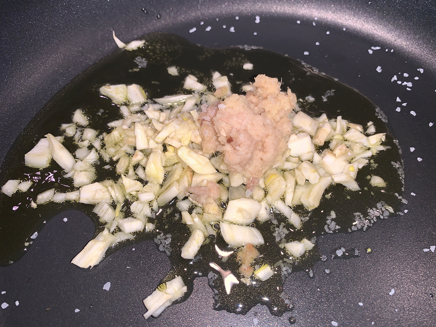 Meanwhile, make the sauce. In a medium 10-inch skillet, heat the remaining 1 tablespoon olive oil over medium heat. Add the garlic, the remaining 2 teaspoons ginger, and a pinch of salt. Cook, stirring, until fragrant and just golden, about 1 minute (lower the heat if the garlic threatens to scorch).