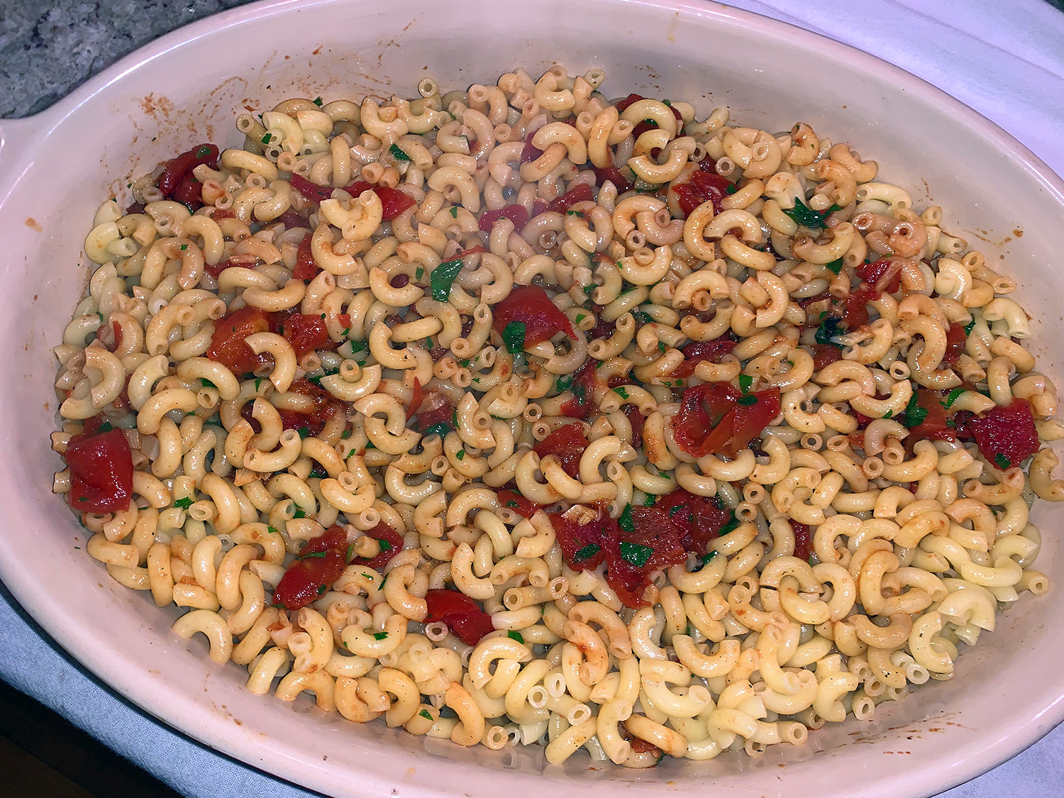Cook the macaroni. About 10 minutes before the chicken is done, bring a large pot of well-salted water to a boil. While the chicken rests, warm a wide, shallow serving dish or bowl big enough for the cooked macaroni; I like to use a 2- to 3-quart gratin or baking dish. A pasta bowl works as well. Cook the macaroni until tender but not mushy, about 7 minutes or according to the package instructions.