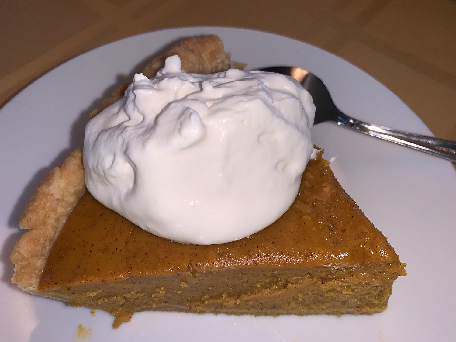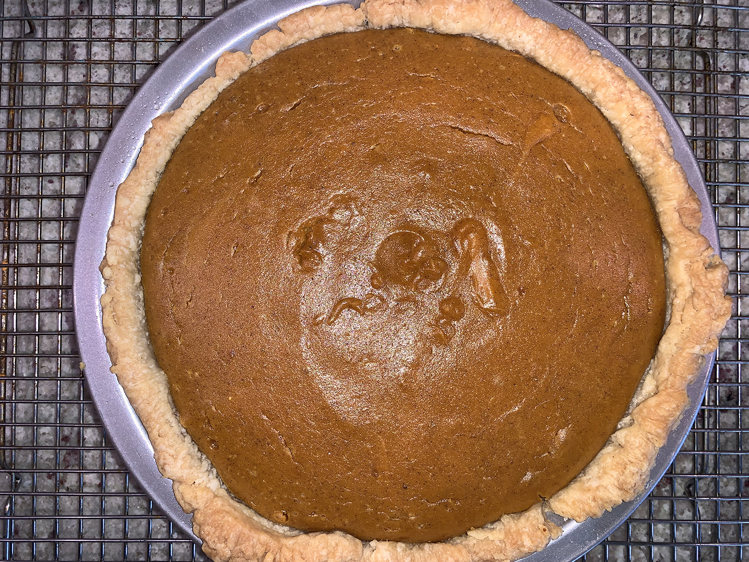 He made the pie from scratch, including the crust, and used butternut squash instead of canned pumpkin. According to chef/auther Melissa Clark, “Making your own fresh purée from sweet winter varieties will give you the best possible pumpkin pie, one that’s both ultracreamy and richly flavored. Just don’t be tempted to halve the whole squash and bake it still in the skin. Cutting it into cubes allows for the most evaporation and condensation for the best texture and taste.”