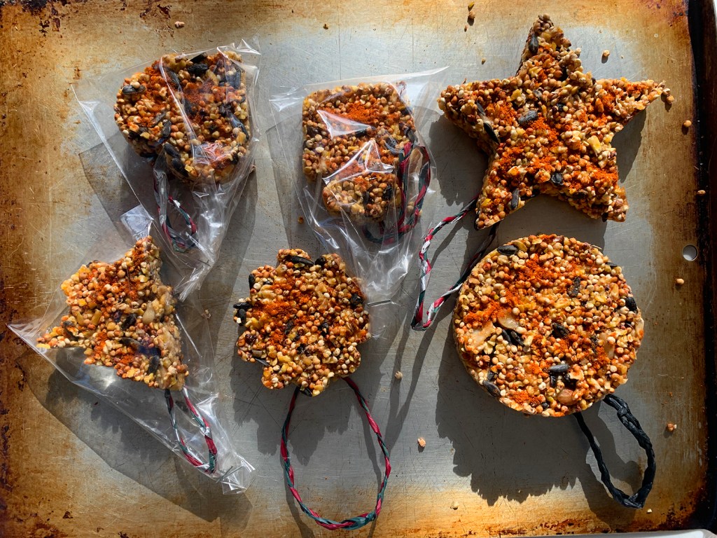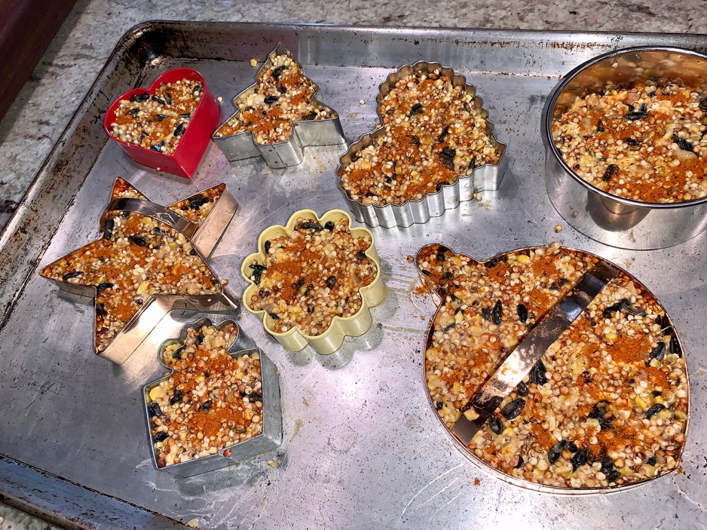 These are great for gifting, even to yourself. Hang them out a window and enjoy the birds that will thank you for a little Christmas treat. I first got the idea from Better Homes & Garden’s recent holiday magazine. However, I made many changes including adding the cayenne to deter squirrels and deer from eating them.