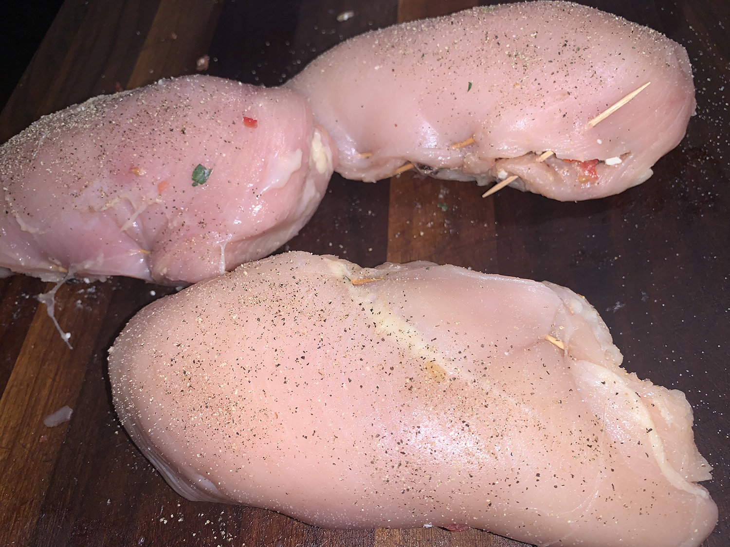 - Using a sharp knife, cut chicken breasts in half horizontally without cutting all the way through, to create a pocket. Stuff each pocket with equal amounts of the feta mixture; fold the chicken back over and secure with toothpicks. Sprinkle with salt and pepper.