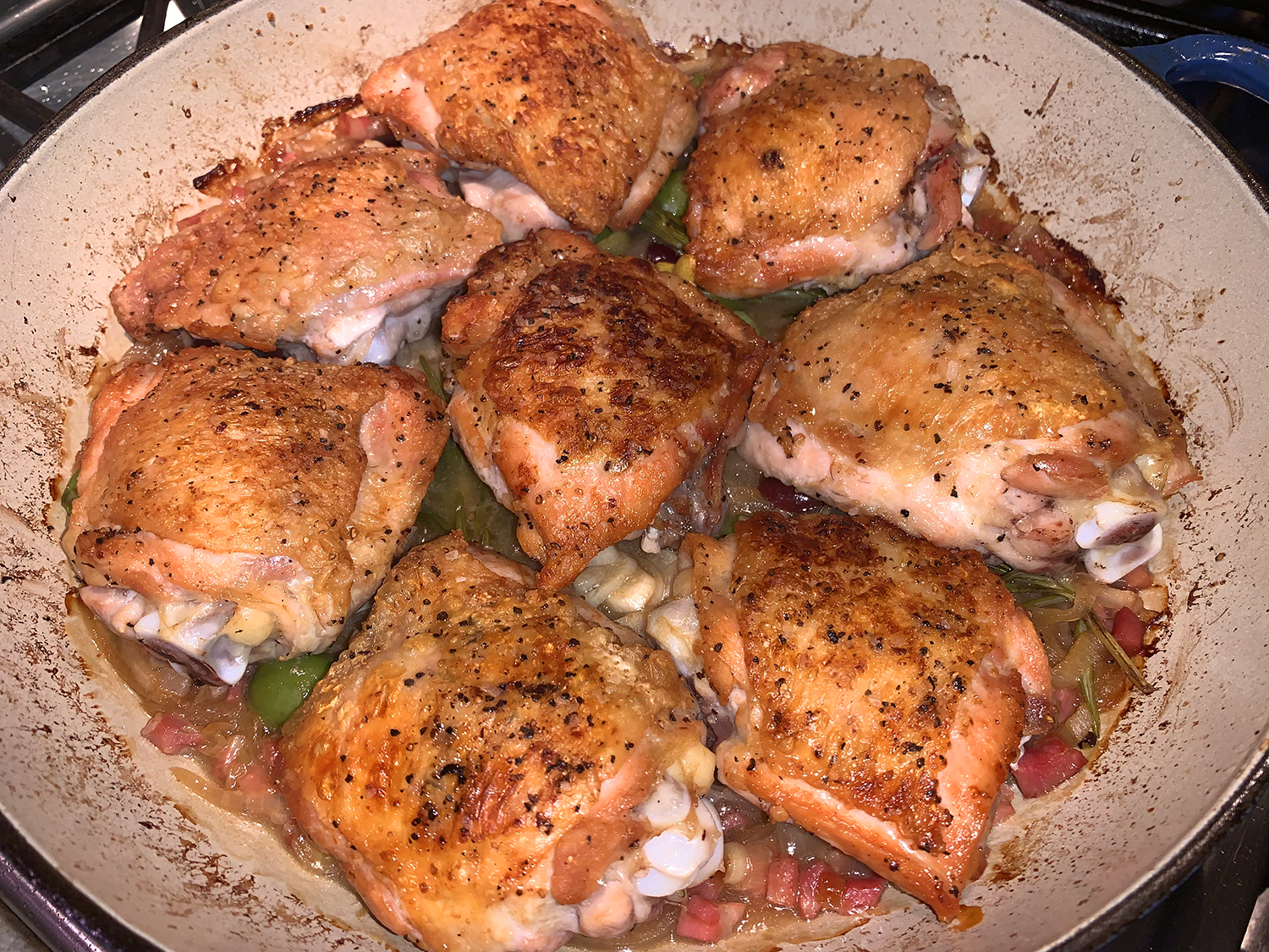 - Pour ½ cup water into pan; transfer skillet to oven, arranging so legs are pointing toward back of oven. Roast until skin has taken on some color, 10–15 minutes. Reduce heat to 325°; continue to roast until chicken is cooked through and tender (an instant-read thermometer inserted into thickest part of breast should register 155°; it will climb to 165° as the chicken rests) and shallots are jammy, 60–70 minutes. Let rest 15 minutes.