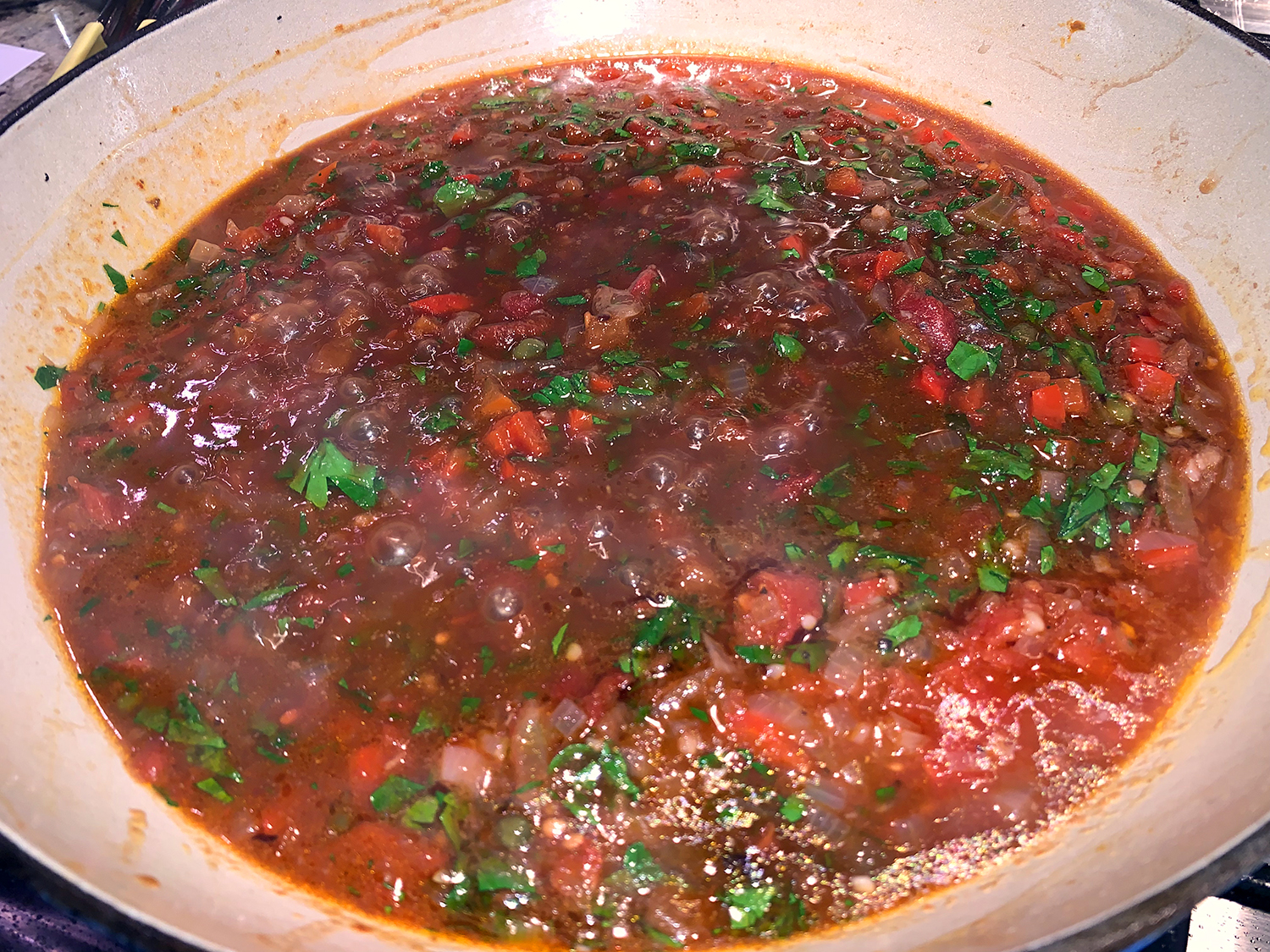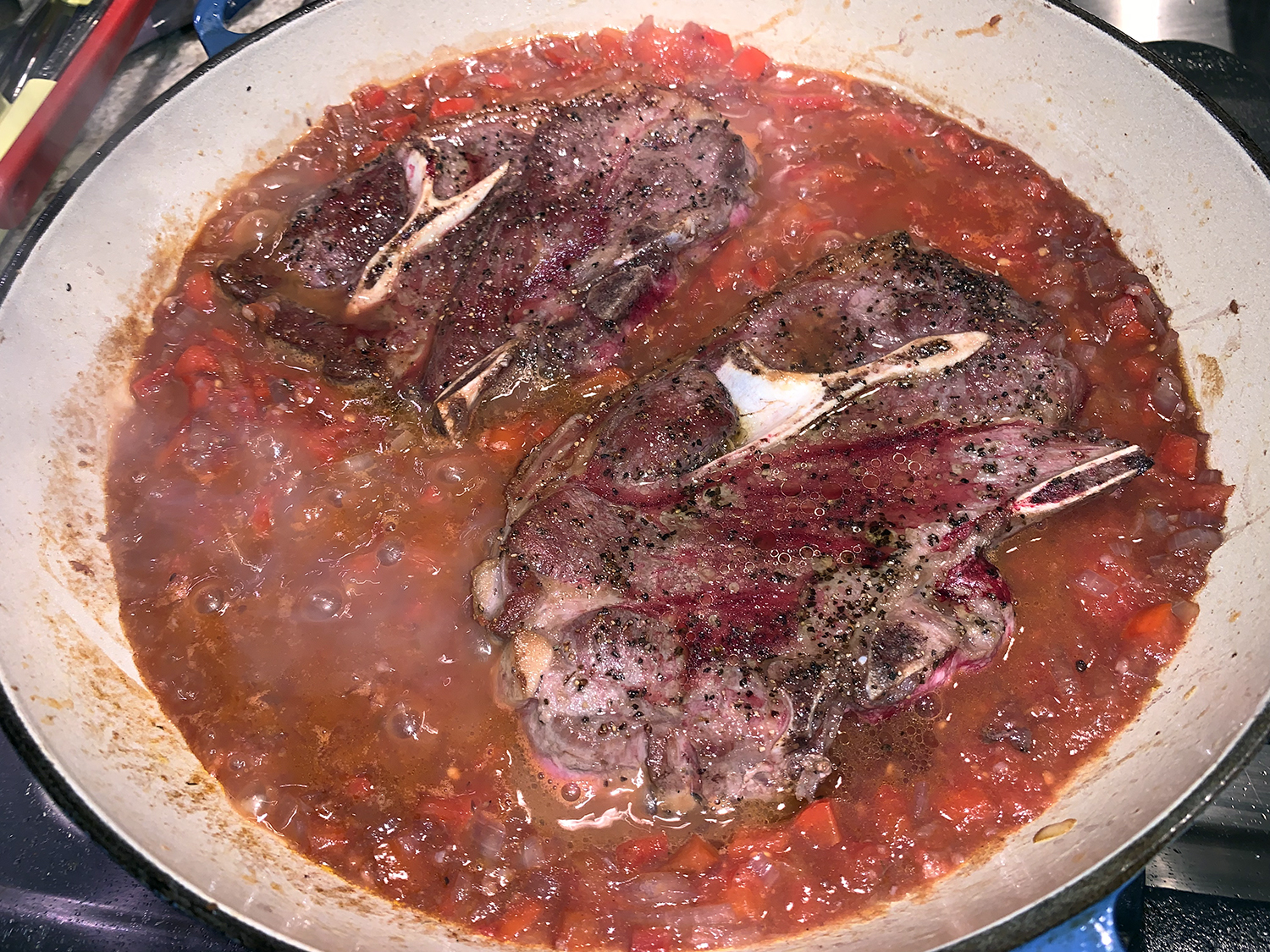 Our initial concerns at the short amount of time (15 to 20 minutes originally) the lamb chops cooked were well-founded. After 20 minutes, they were still tough and we added another 10 minutes to the braise. In fact, they could have used even more time to tenderize. In the past, we’ve always braised them, covered over low heat for 2 hours, until they were fall-apart tender.