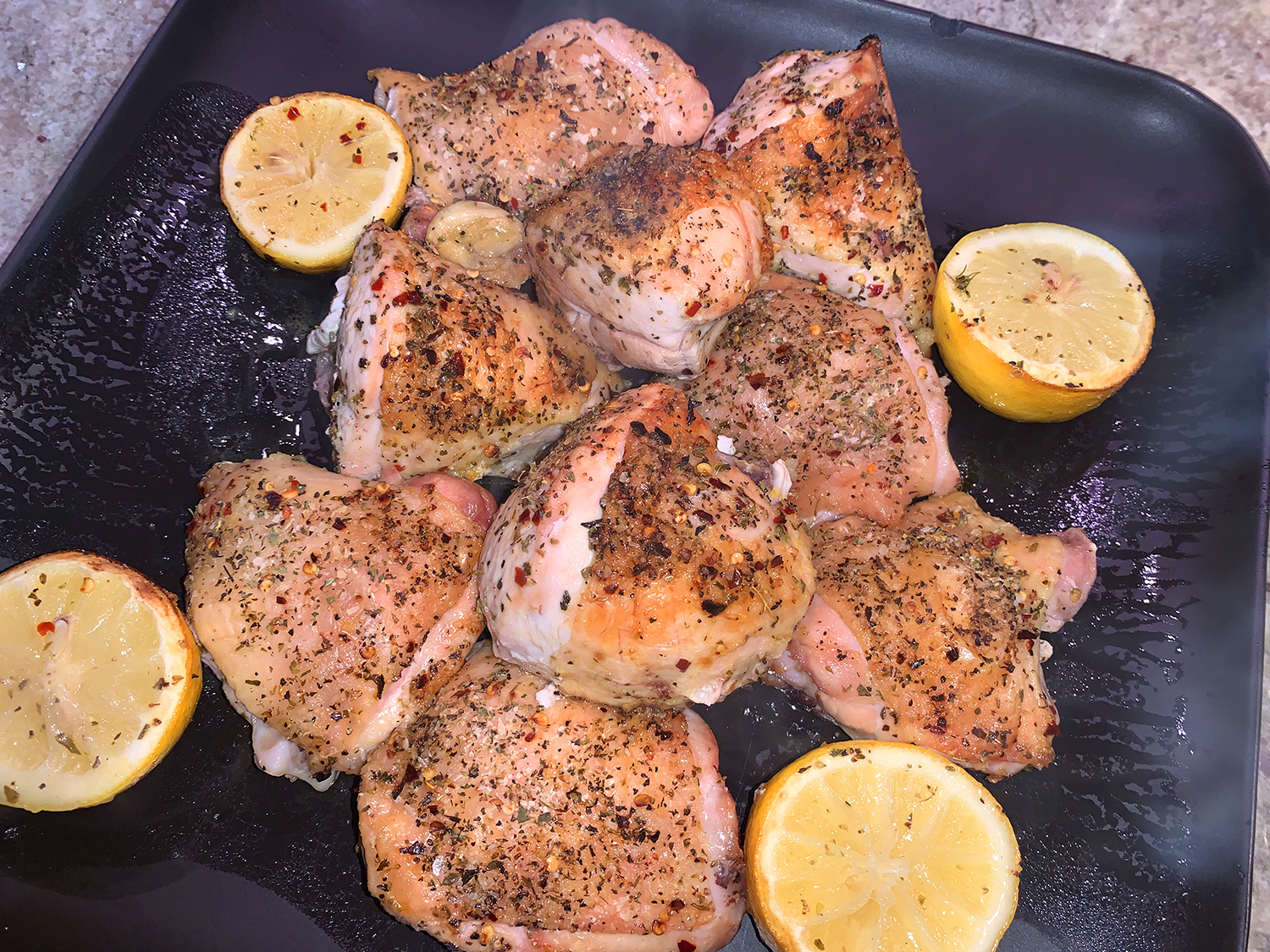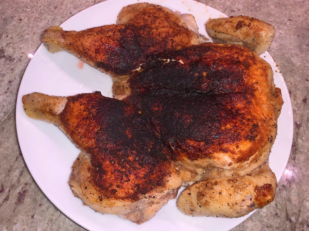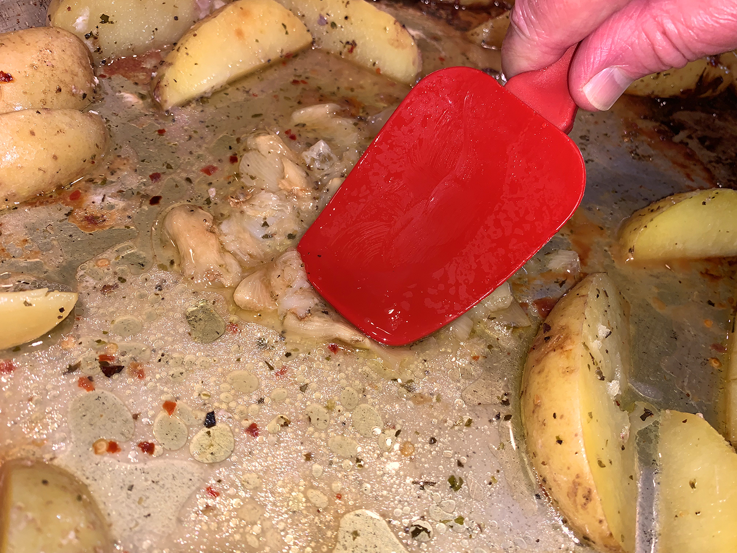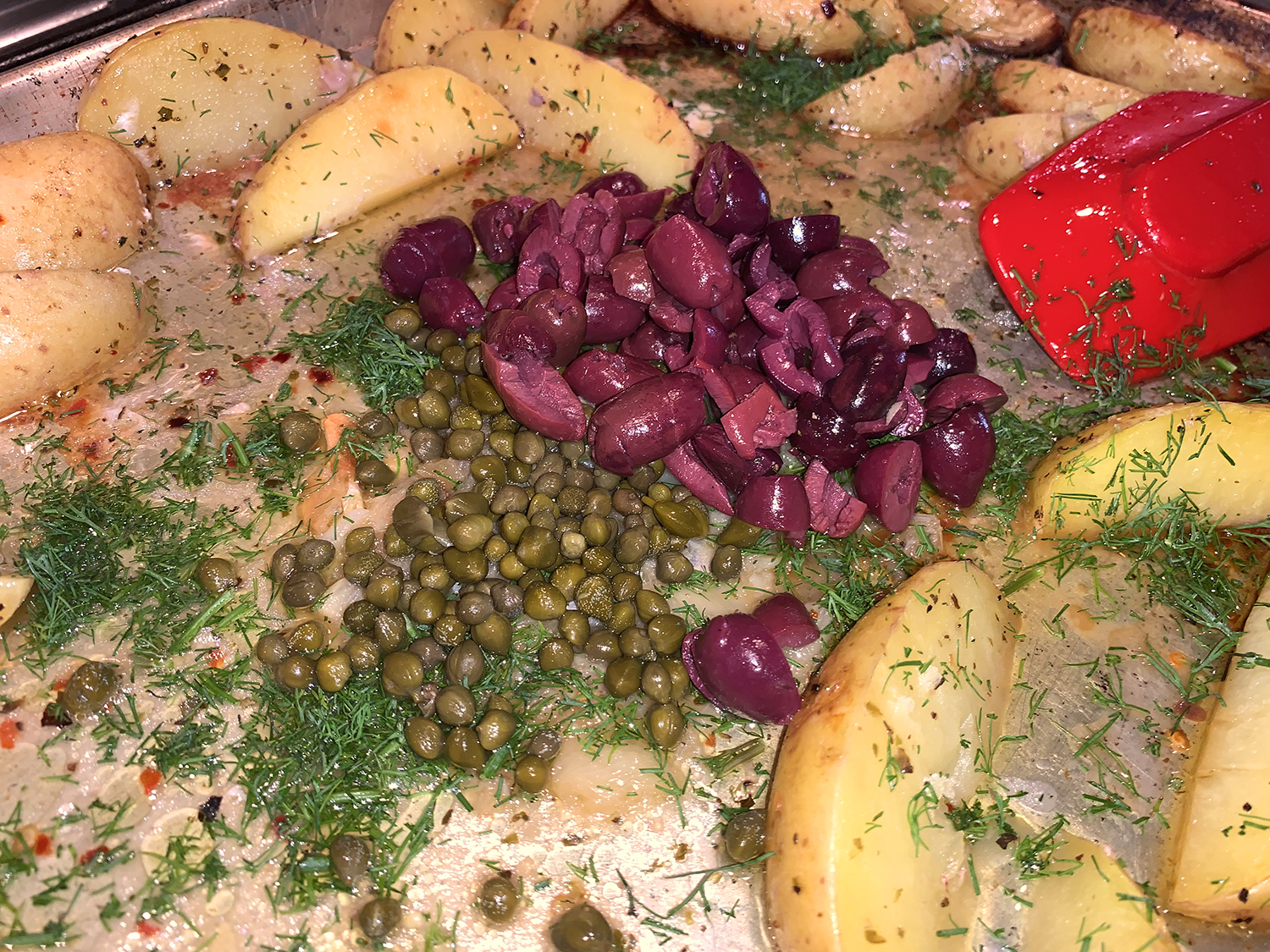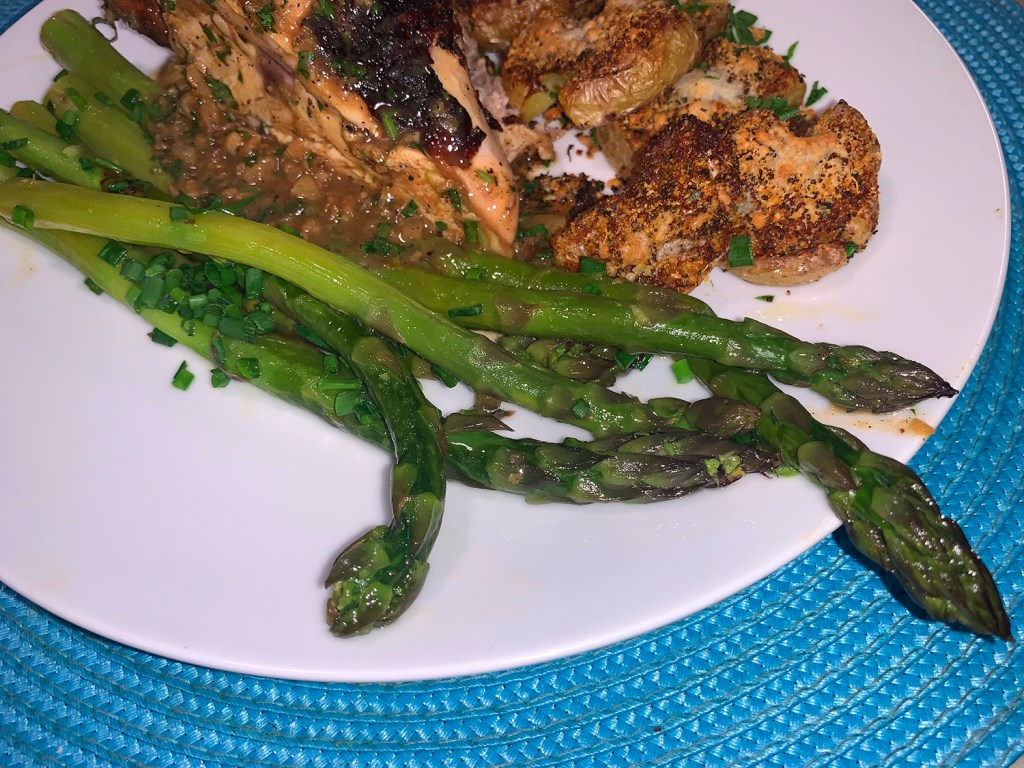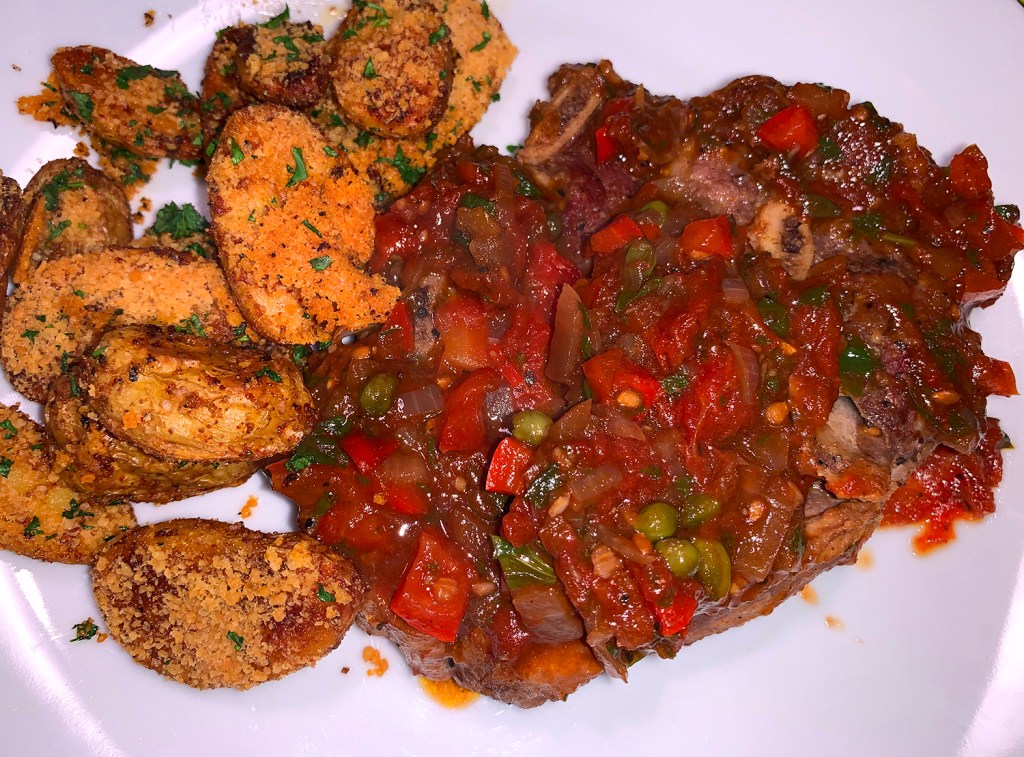 The much-anticipated caper and red pepper sauce with the deglazing liquid was delicious! Because we only cooked two chops, there was some sauce leftover which we made good use of on some pork chops the following day. Our pairings for the lamb included a side salad and a recent new potato fave, Crispy Parmesan Potatoes.